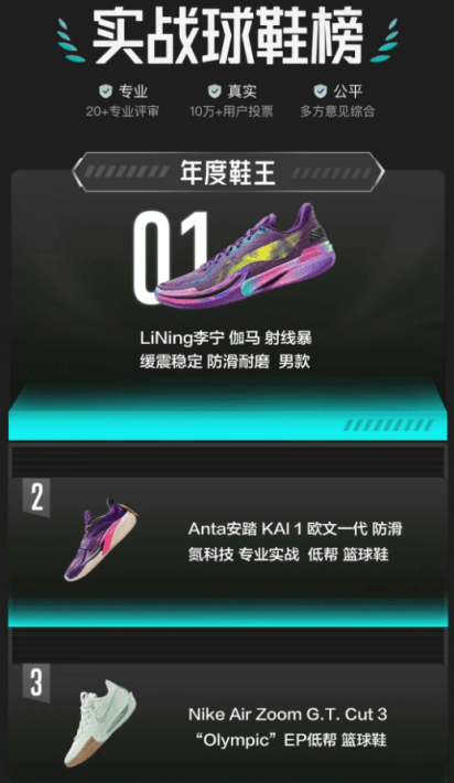 在得物2024年度鞋王榜单上,李宁伽马射线暴登顶实战球鞋榜。2025年,在滔博、识货等业内平台发布的年度球鞋榜单上,耐克凭借Ja2、Ja3、G.T.Cut 3、Kobe 6、Kobe 8、A J1、A J4等鞋款近乎横扫,国内品牌上榜次数最多的则是李宁,包括韦德之道12、JB4等热门鞋款。