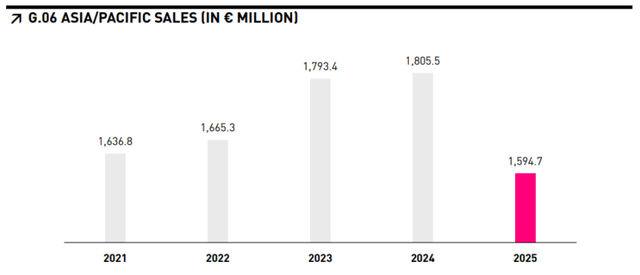今年2月底,彪马发布2025年财报,公司全年销售额同比下降8.1%至72.96亿欧元💶;其中,中国市场所在的亚太区域销售额下降7.4%至约15.95亿欧元💶;年度净亏损约6.46亿欧元💶,同比转亏;整体毛利率同比下降260个基点至45%。