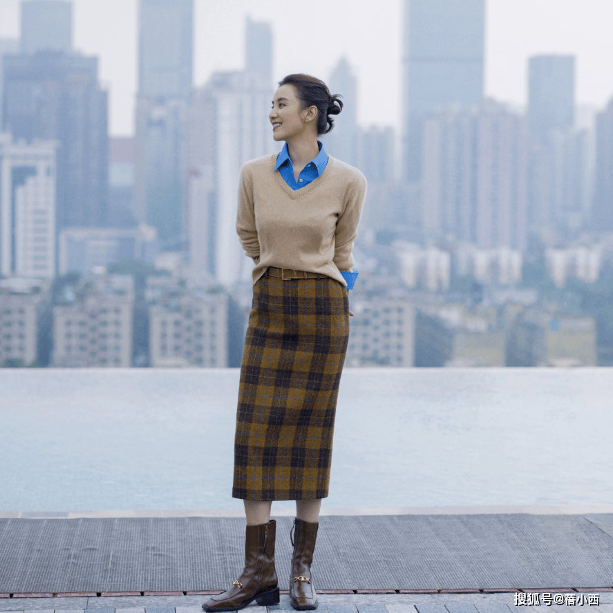 V领『针织衫』的版型很修身,勾勒出纤细的上半身线条,而衬衫的挺括感则撑起了气场,一柔一刚,尽显女性♀️多面魅力。下身的格纹半身裙采用棕黄配色,与『针织衫』相呼应,经典的格纹元素自带复古高级感,开衩的直筒版型修饰了腿型,再加上长度过膝不盖踝,利落又端庄。脚踩棕色皮质长筒靴,与格纹半身裙完美衔接,能够在视觉上拉长腿部比例。
