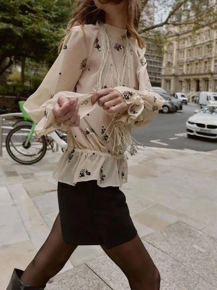 繁复单品切忌堆叠,比如带蕾丝荷叶边的下装,搭配简约利落的上衣,让精致感有重点,不杂乱臃肿。