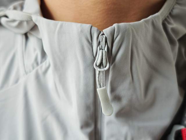 带拉绳的拉链方便我们拉取的操作,下颚位置的防护避免了拉链头磨蹭到我们的下巴。