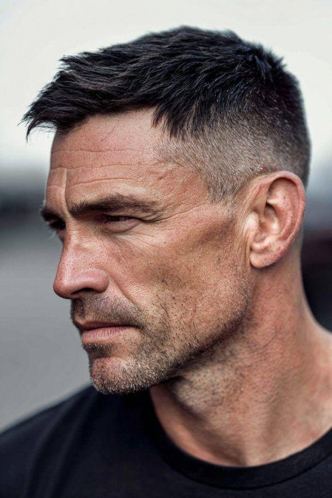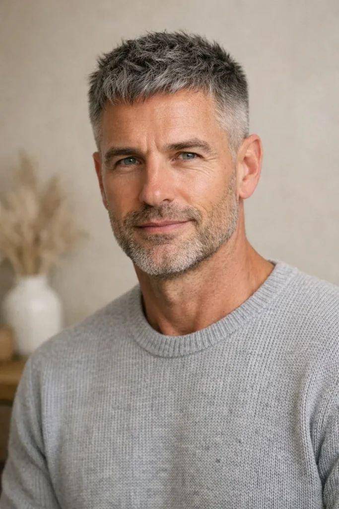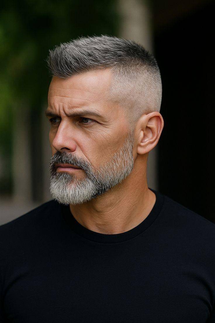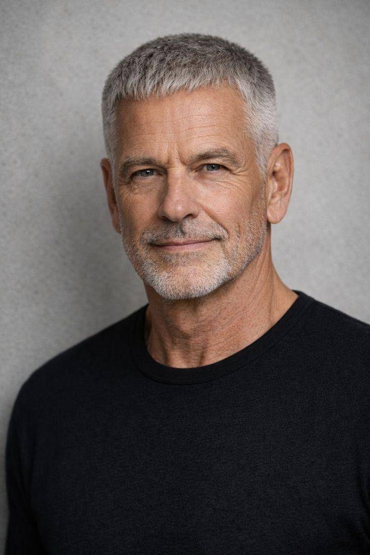 极短的发丝贴合头皮,银灰色均匀覆盖,完美凸显面部轮廓与立体五官,尽显成熟男性♂️的果敢与霸气。这款发型无需费心打理,清爽易维护,自带强大气场,是性格爽朗、追求简约霸气风格男士的不二之选。