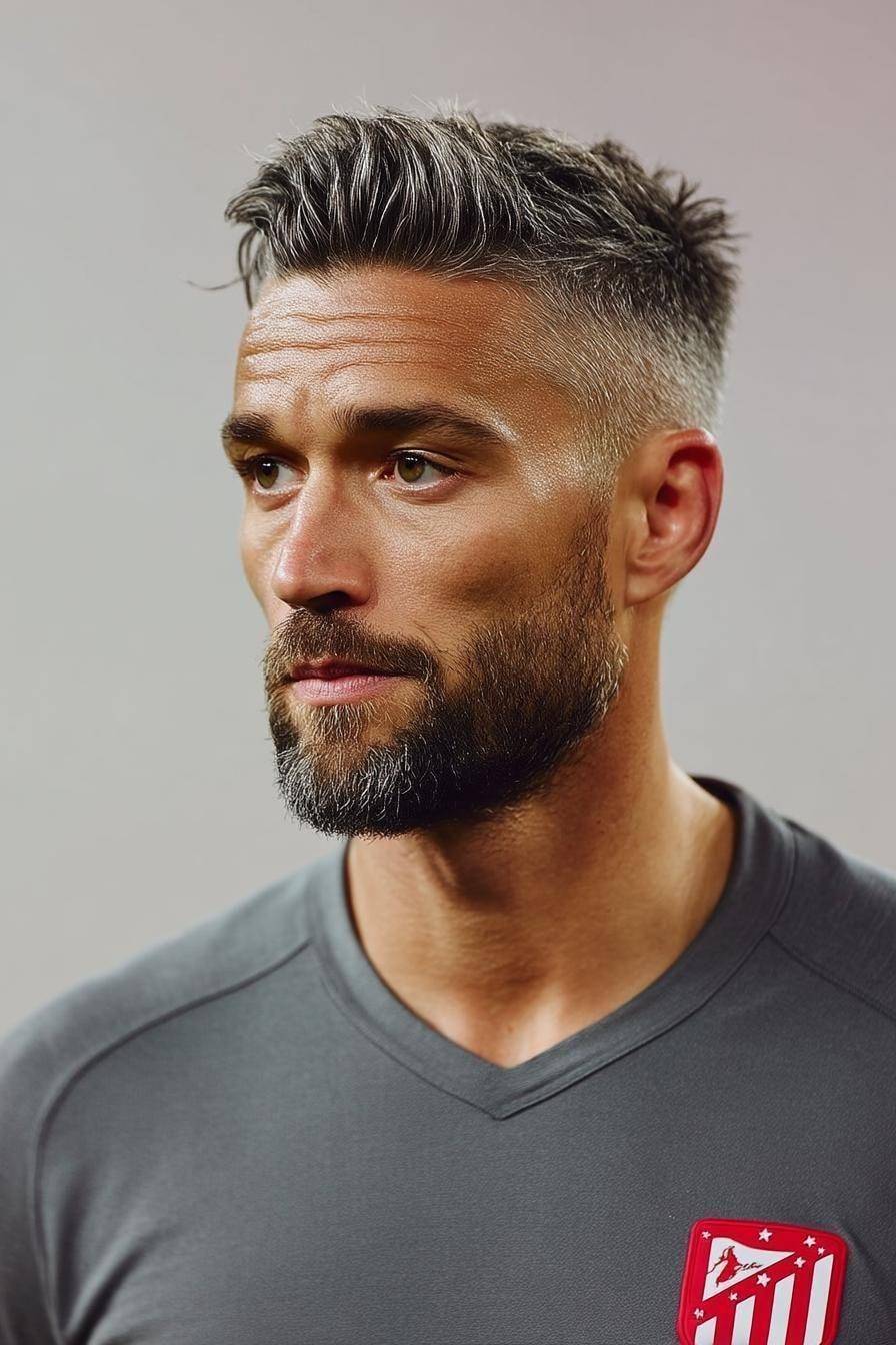 渐变短发是银灰发色最经典的搭配,也是成熟男士的百搭首选。这款发型主打清爽利落,两侧及后颈采用渐变推剪处理,发丝由短至长自然过渡,干净整洁不拖沓,顶部保留适度长度,整体轮廓硬朗有型。