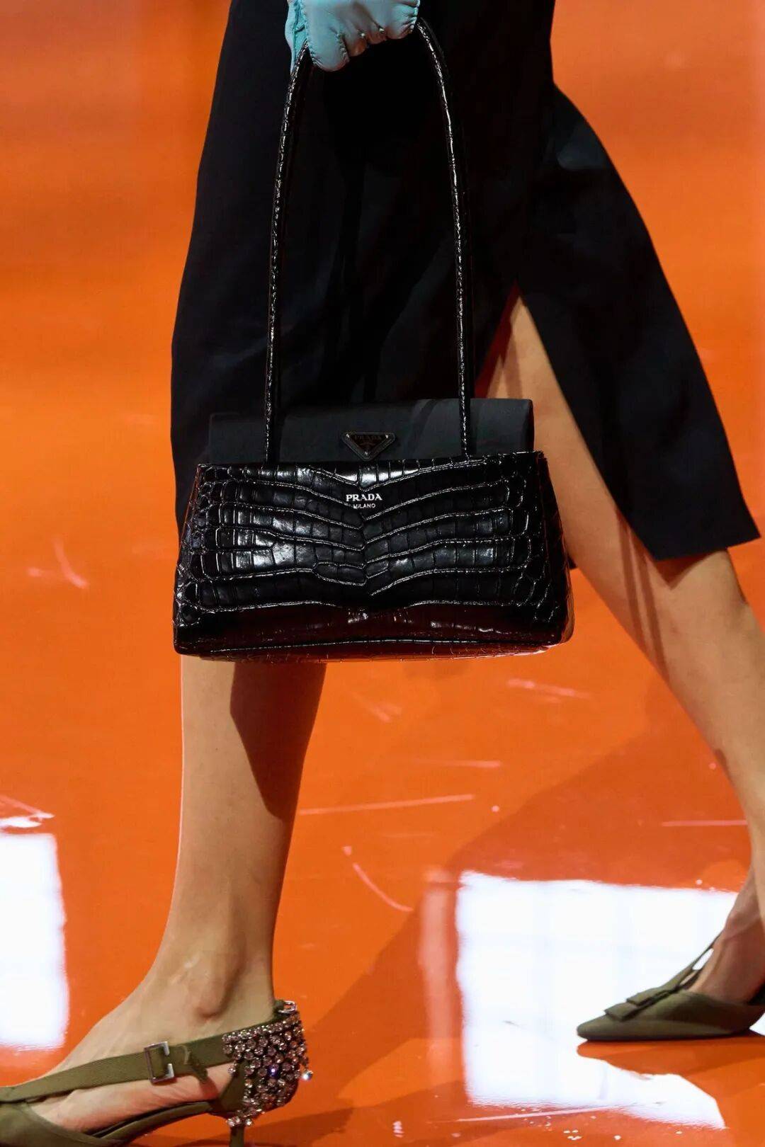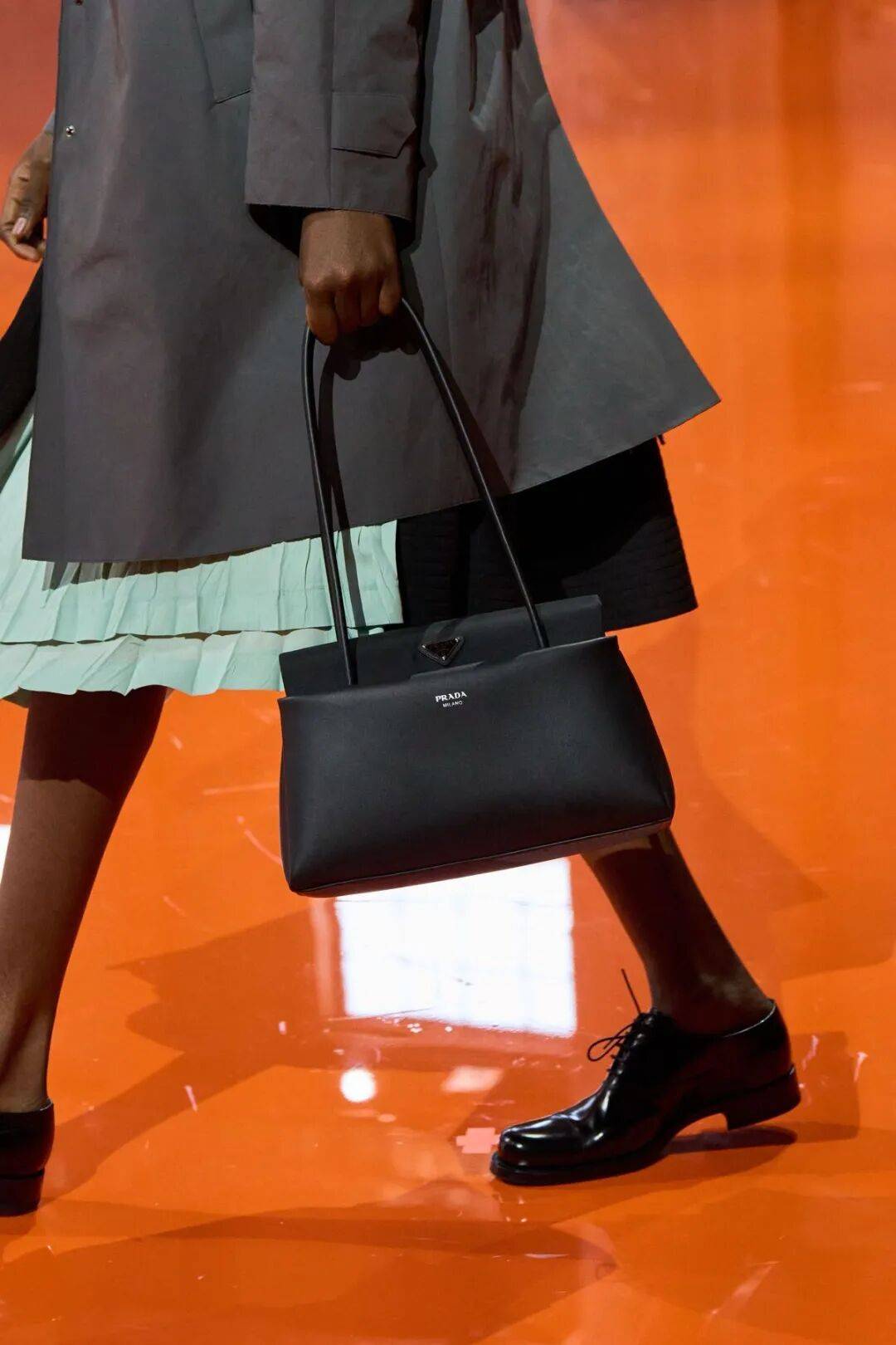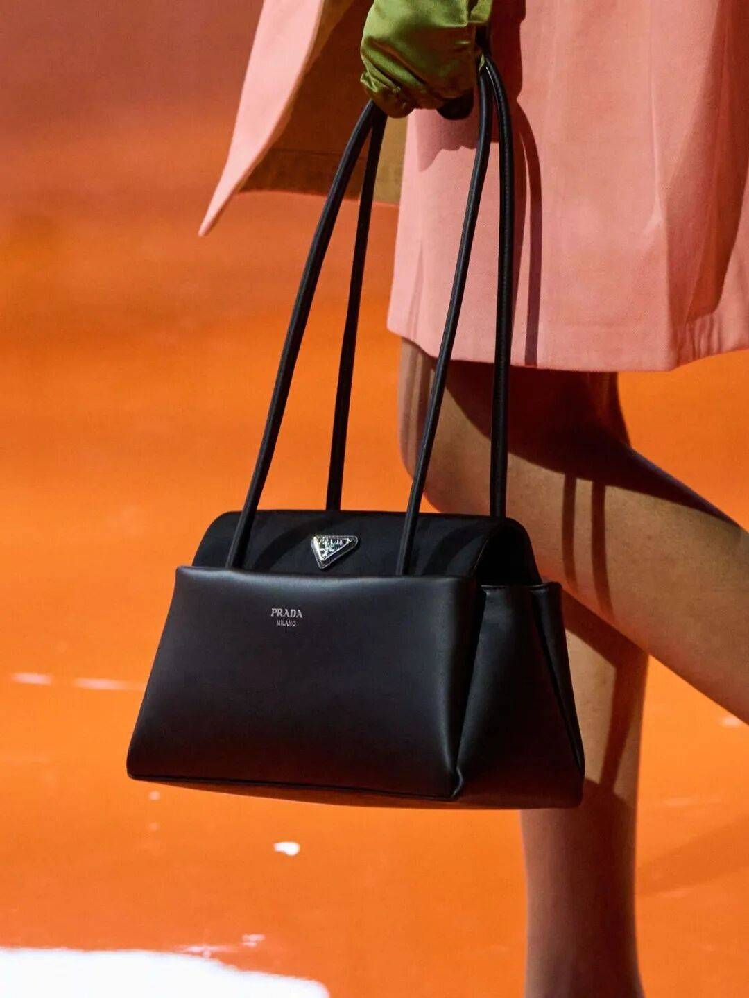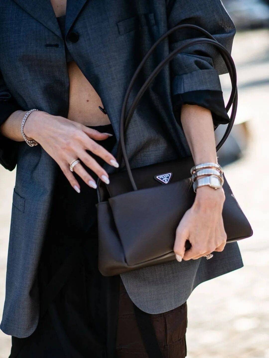 只是用Prada标志的再生尼龙与皮革的组合方式很呈现,尼龙在包盖,皮革在包身,材质之间的碰撞让整只包看起来既现代又复古。