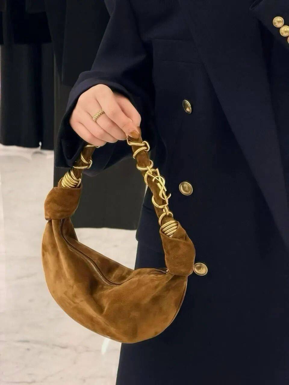 不大不小的尺寸,恰好迎合多数女生的身形比例,既有存在感又不会显得笨重。绒面革材质带着天然的温暖质感。