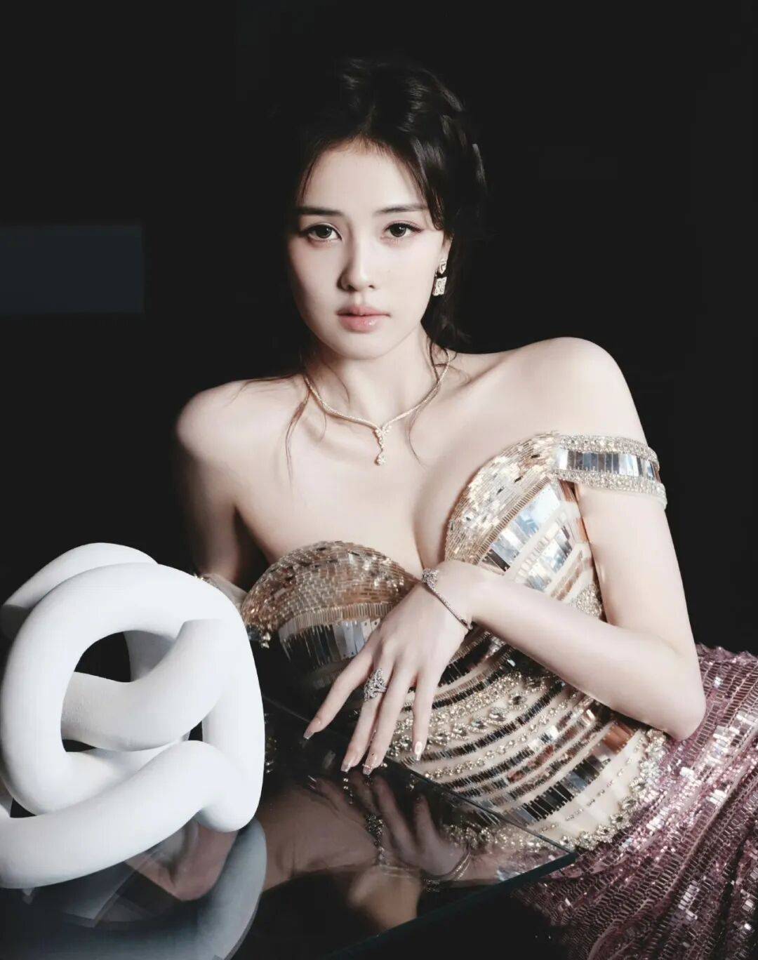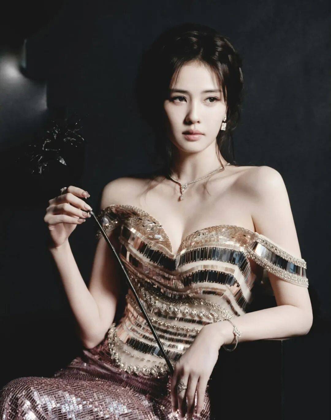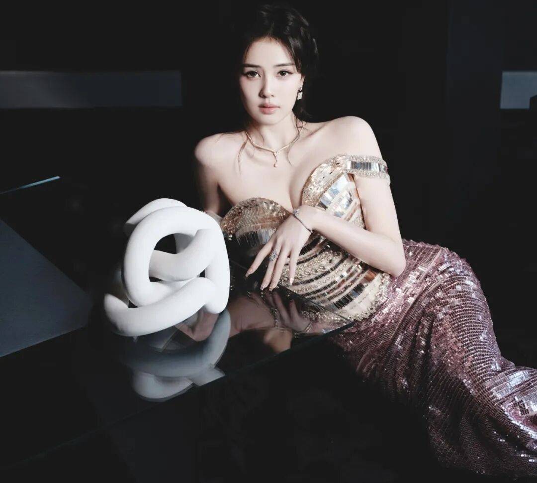 再来看配饰。她戴的是全套De Beers的珠宝,项链、耳饰、手链、戒指💍都配齐了。De Beers家的钻石大家都知道,切工和火彩都是顶级的,那个钻石的光芒跟礼服上的亮片放在一起,不是抢风头,而是互相成就。亮片是细碎的光,钻石是凝聚的、闪耀的光,两种光叠在一起,整个人的轮廓都像是在发光。而且钻石的线条很纤细,不会让人觉得身上挂了很多东西很重,反而把亮片裙那种稍微有点厚重的质感给中和了,让整体看起来更轻盈。特别是那对耳饰,在低盘发的映衬下,刚好露出来,随着她转头或者低头,一晃一晃的,特别抓人眼球。