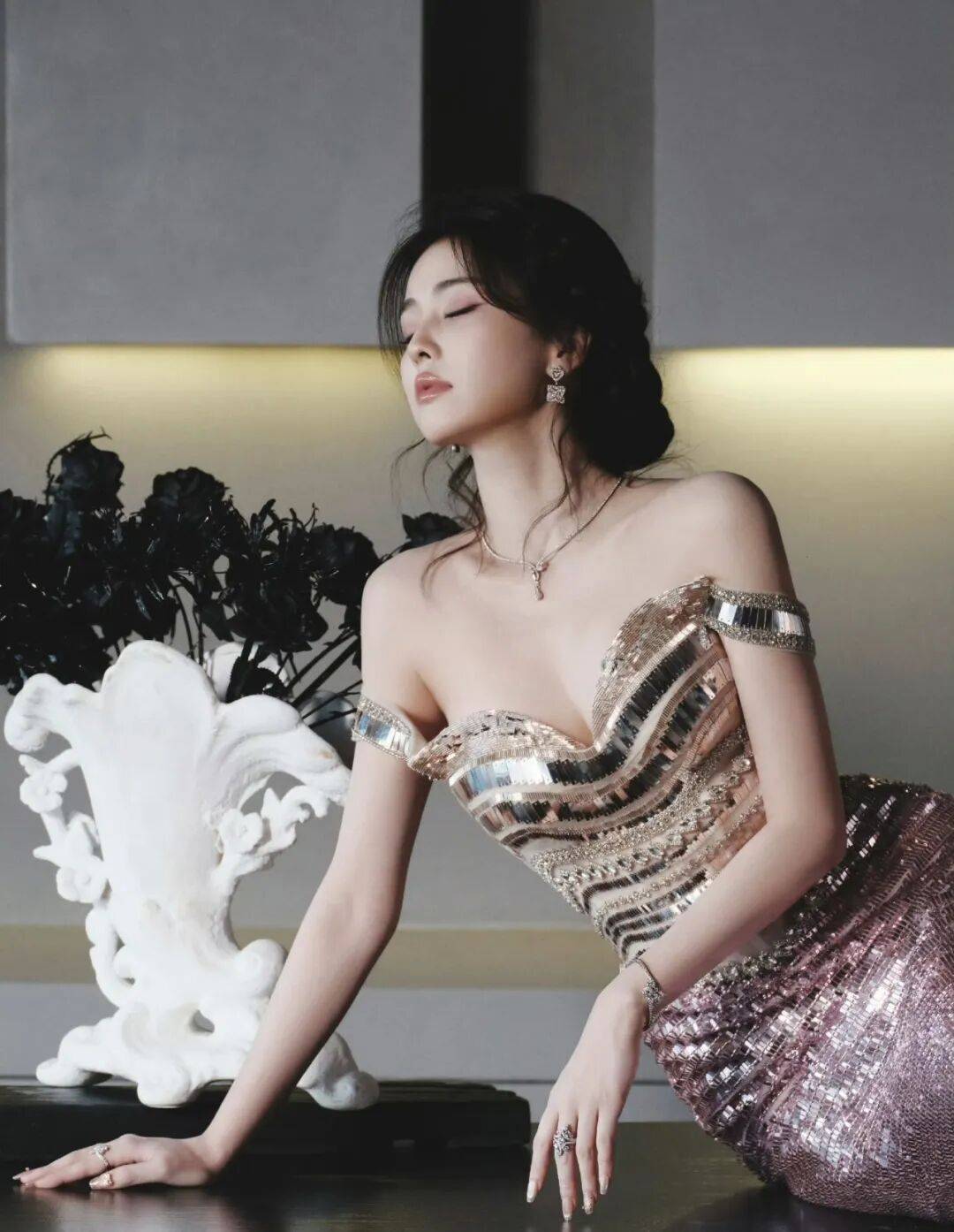她的眼神和肢体语言透着一种游刃有余的松弛,好像不是在直播工作,而是在自己家里随便走走被拍下来了。光线用得也很妙,是那种暖调的侧光打在身上,不是正面直愣愣的强光。侧光一打,亮片和钻石的光泽就有了层次,有的地方亮,有的地方暗,闪起来更自然。同时这个光线也柔化了她的面部轮廓,让整个人看起来朦朦胧胧的,高级又温柔。