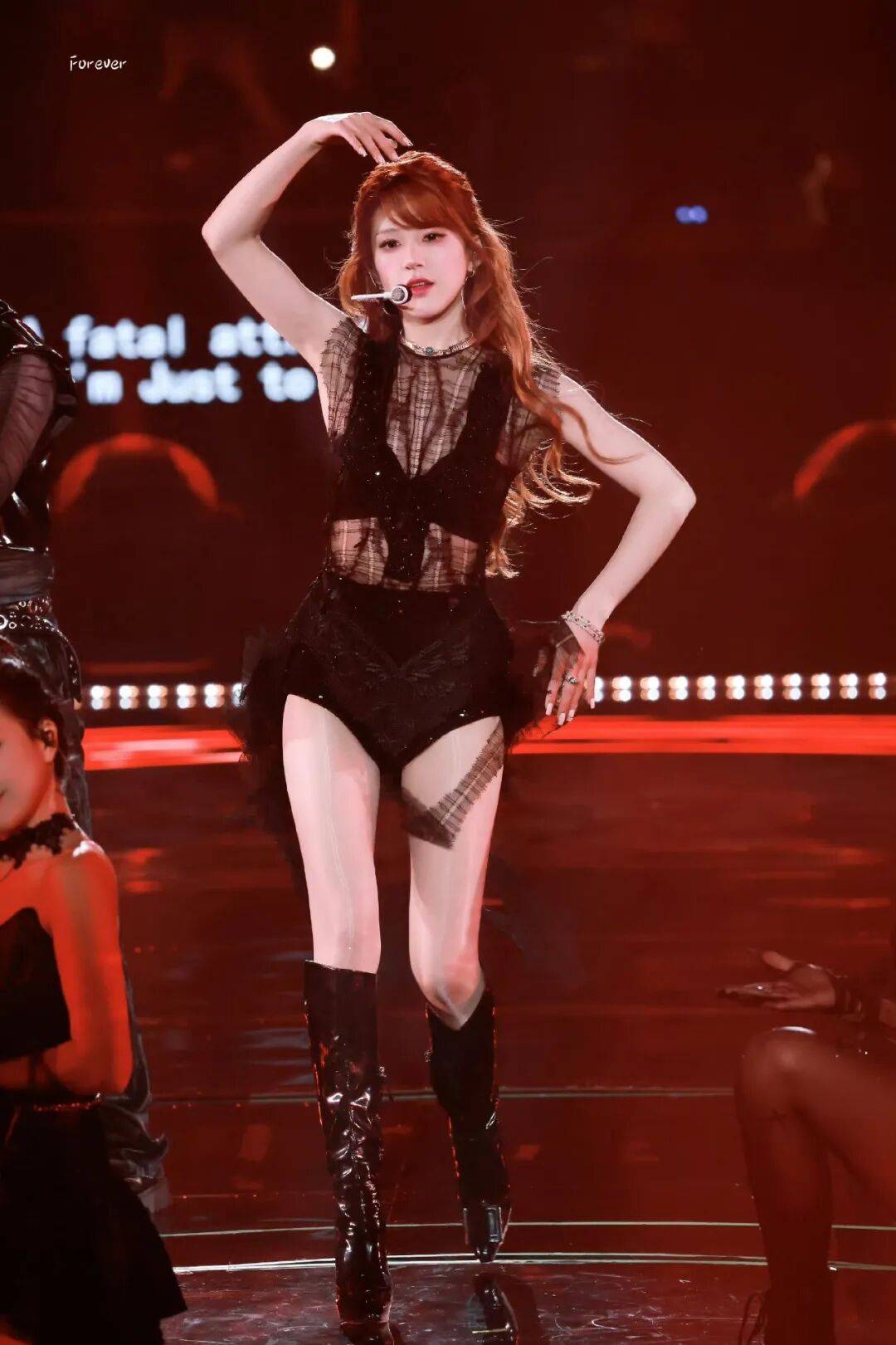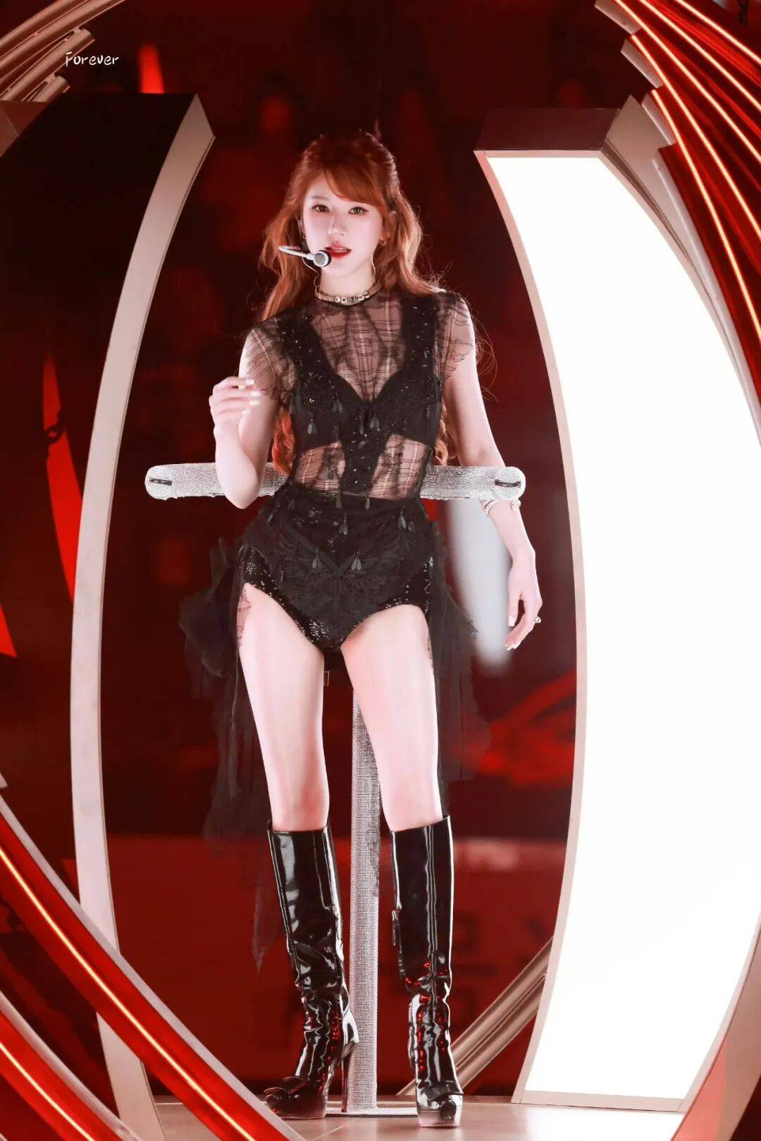 这套透视装造型堪称点睛之笔,薄纱面料轻盈通透,自带朦胧高级感,薄纱之下,肌肤若隐若现,不刻意卖弄却极具视觉冲击力。流畅优美的肩臂线条、紧致纤细的腰腹轮廓被巧妙勾勒,在遮掩与展露之间拿捏得恰到好处,既保留了几分神秘氛围感,又大胆释放着独属于女性♀️的魅力,分寸感拉满。