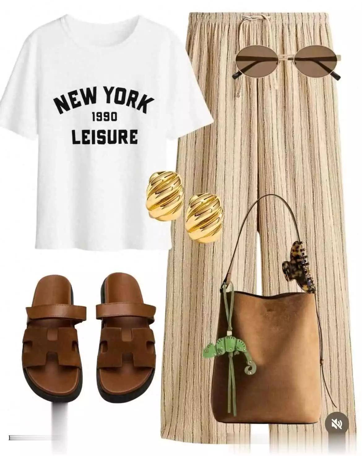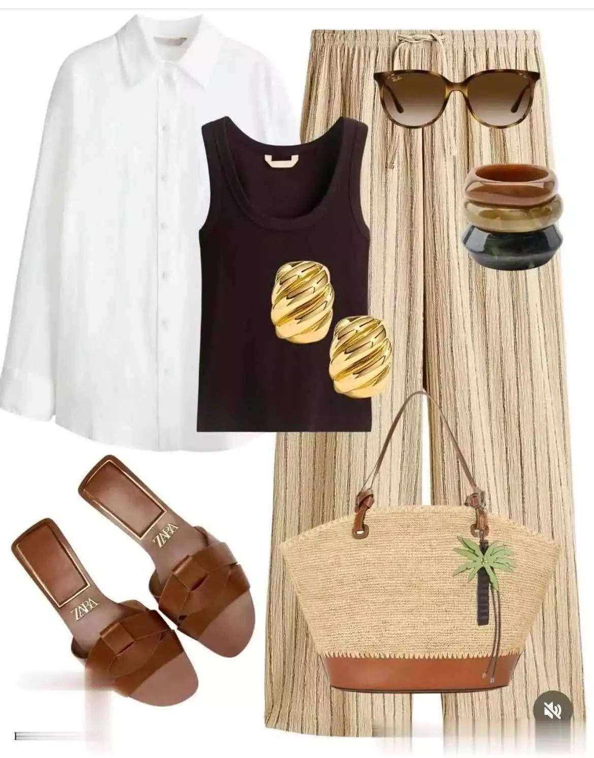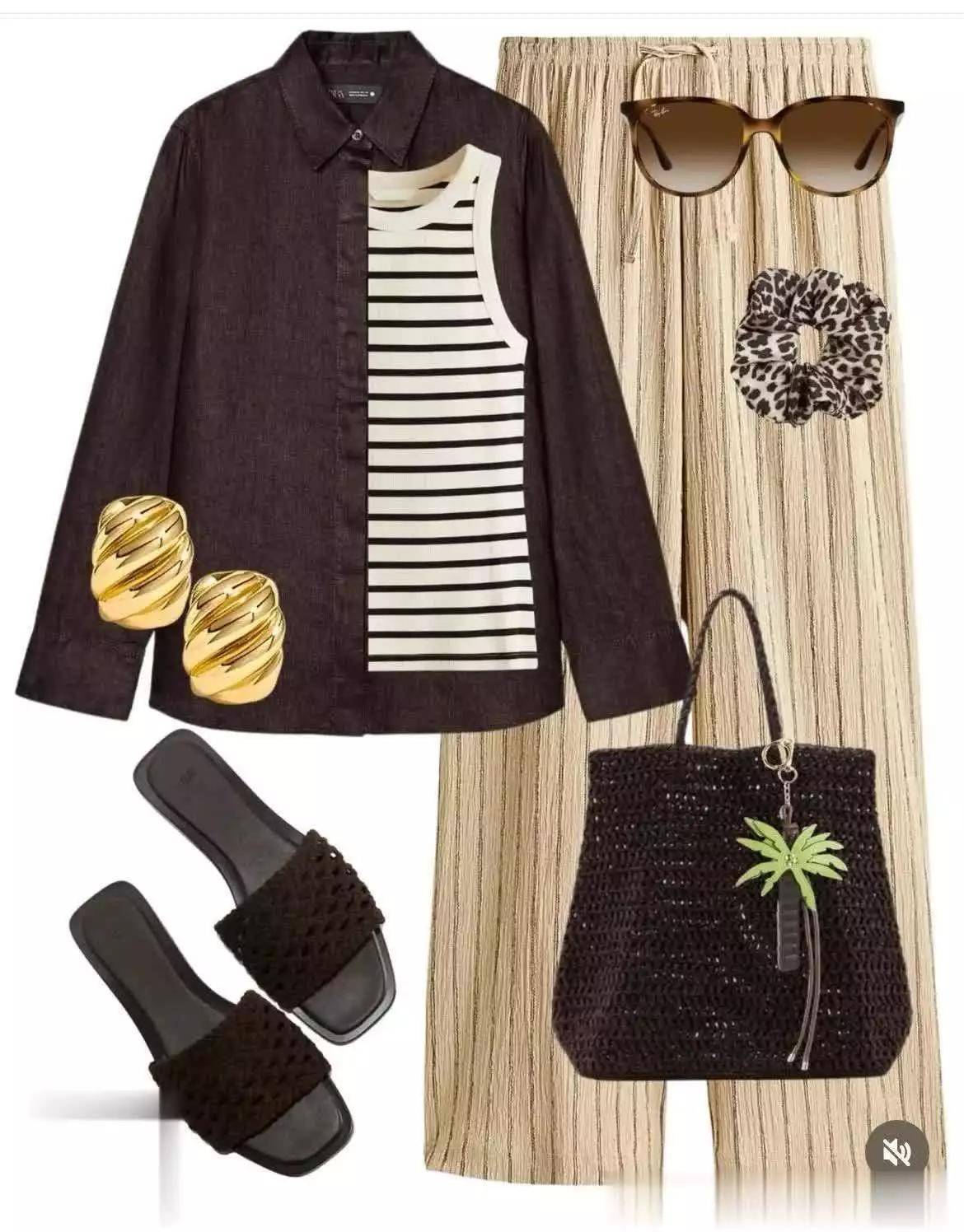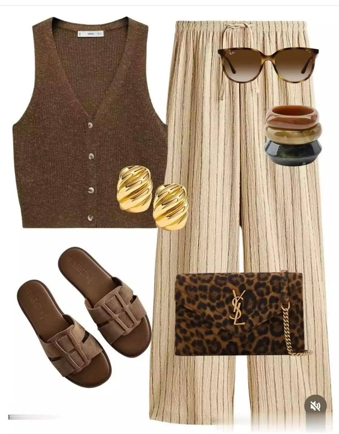今年针织质感依然流行,冰丝面料很凉爽,用在咖色马甲上就很理想,再搭配细纹长裤,凉爽还利落。加一款豹纹信封包更吸睛哦。