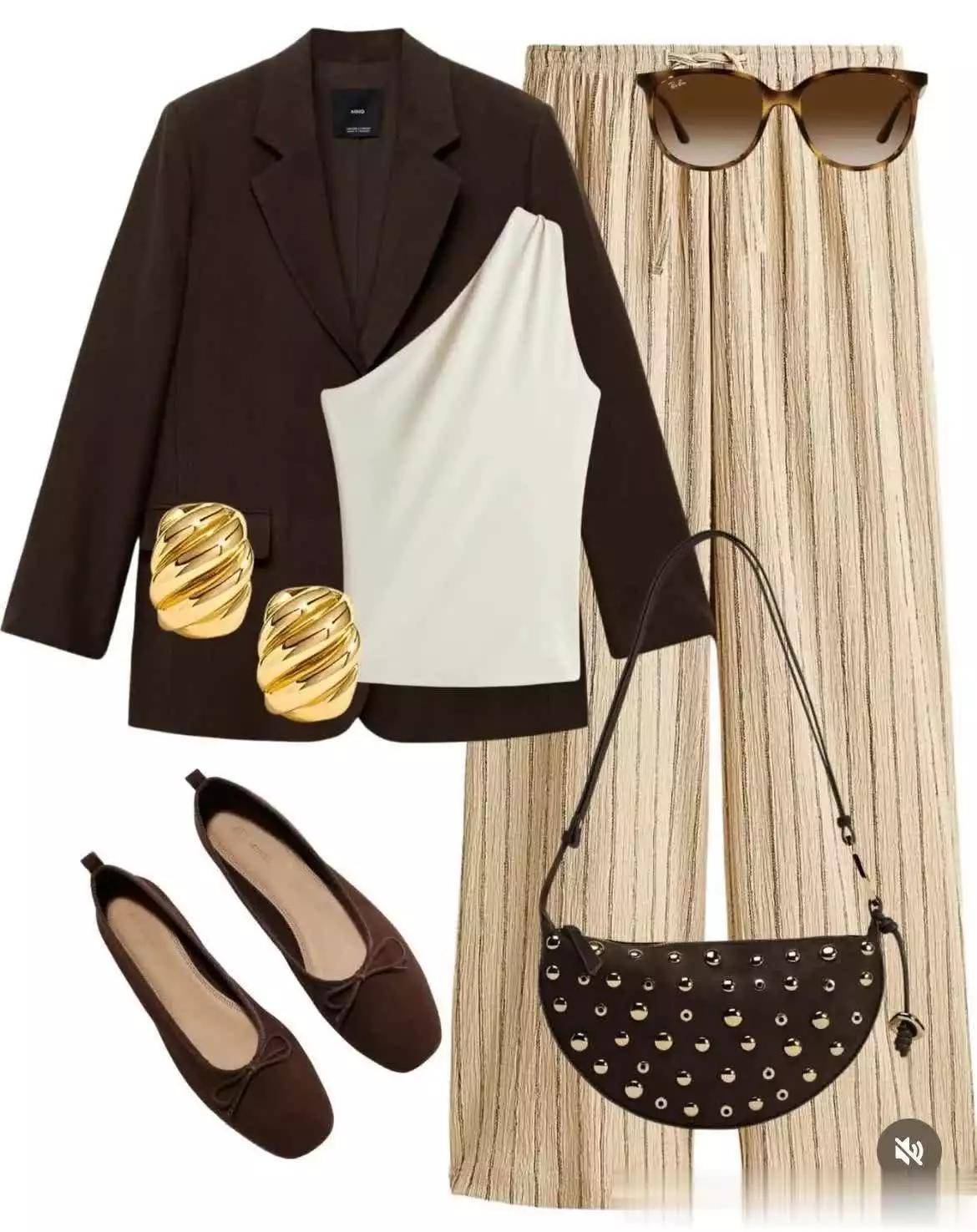 西装自然也可以搭出又一身搭配啦,尤其是规整直线感的深咖西装,与柔软裤脚形成很好的平衡。斜肩款的浅白背心恰好的增加女人味,拎起铆钉装饰的翻盖小包,干练也精致。