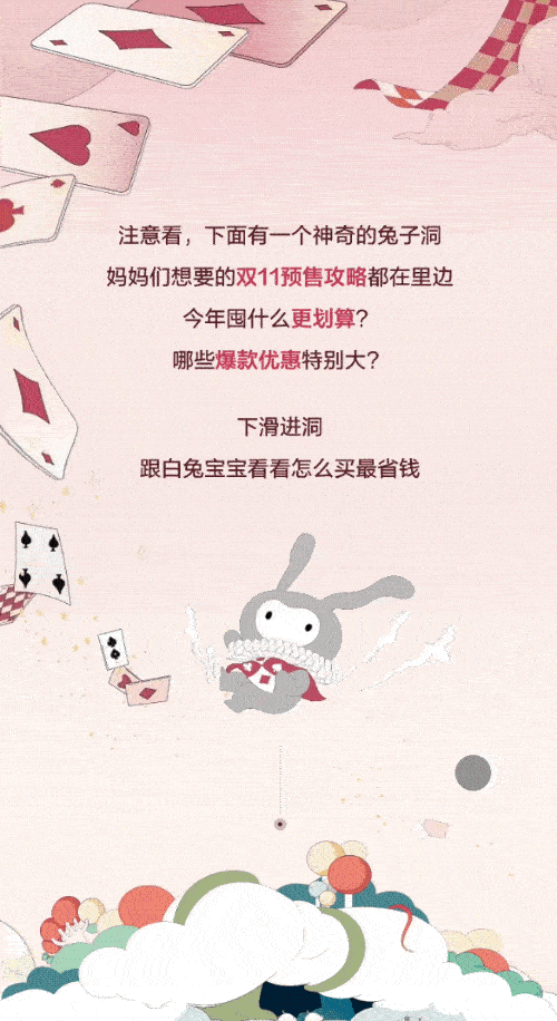 - 错层滑动:《再晚就不礼貌了!双11攻略到!》把产品固定在画面中央,用户滑动屏幕切换场景,跟着“白兔宝宝”进“兔子洞”看预售攻略,不知不觉就记住优惠。