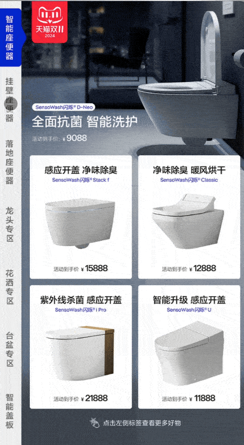 - 无限选择器:像《双11 | 当浴室贴上“能耗标识”:省金啊!》那样,把智能座便器、花洒、台盆按品类分栏,左侧设标签,点击就能切换详情,9088元起的活动价一目了然,不用翻长图找信息。