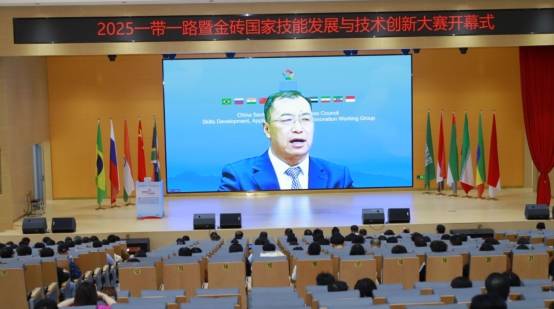 金砖国家技能发展与技术创新大赛组委会代表杜红杰先生现场播放了大赛执委会主席刘振英博士的开幕致辞。刘振英主席在致辞中强调,金砖大赛始终致力于推动各国在技能发展与技术创新领域的深度合作,为青年技术人才搭建国际化竞技交流平台。