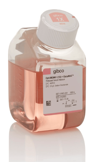 Opti-MEM™ I 减血清培养基是一种内含胰岛素、转铁蛋白、次黄嘌呤、胸苷和微量元素的独特培养基。这些附加组分可使血清添加量减少至少 50%。Opti-MEM™ I 培养基使用碳酸氢钠缓冲系统 (2.4 g/L),因此需要 5–10% CO2 环境来维持生理 pH 值。