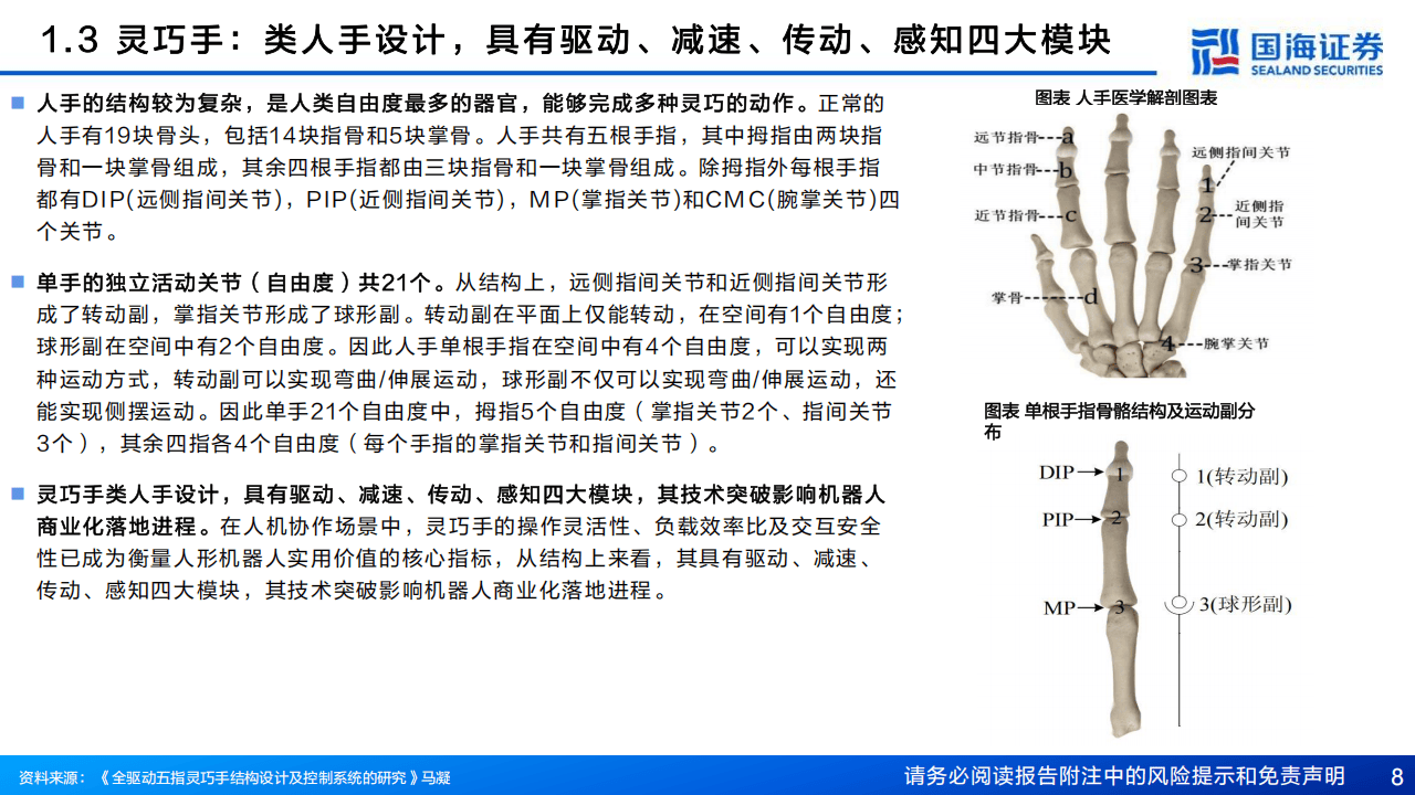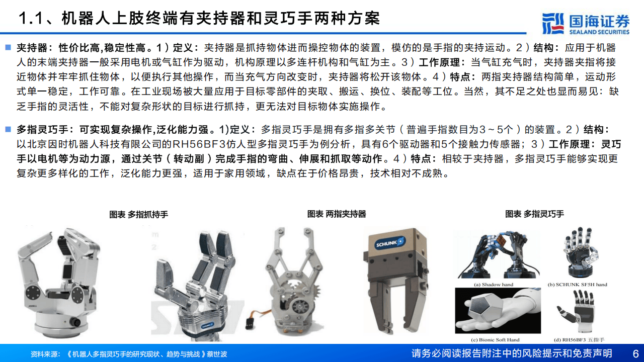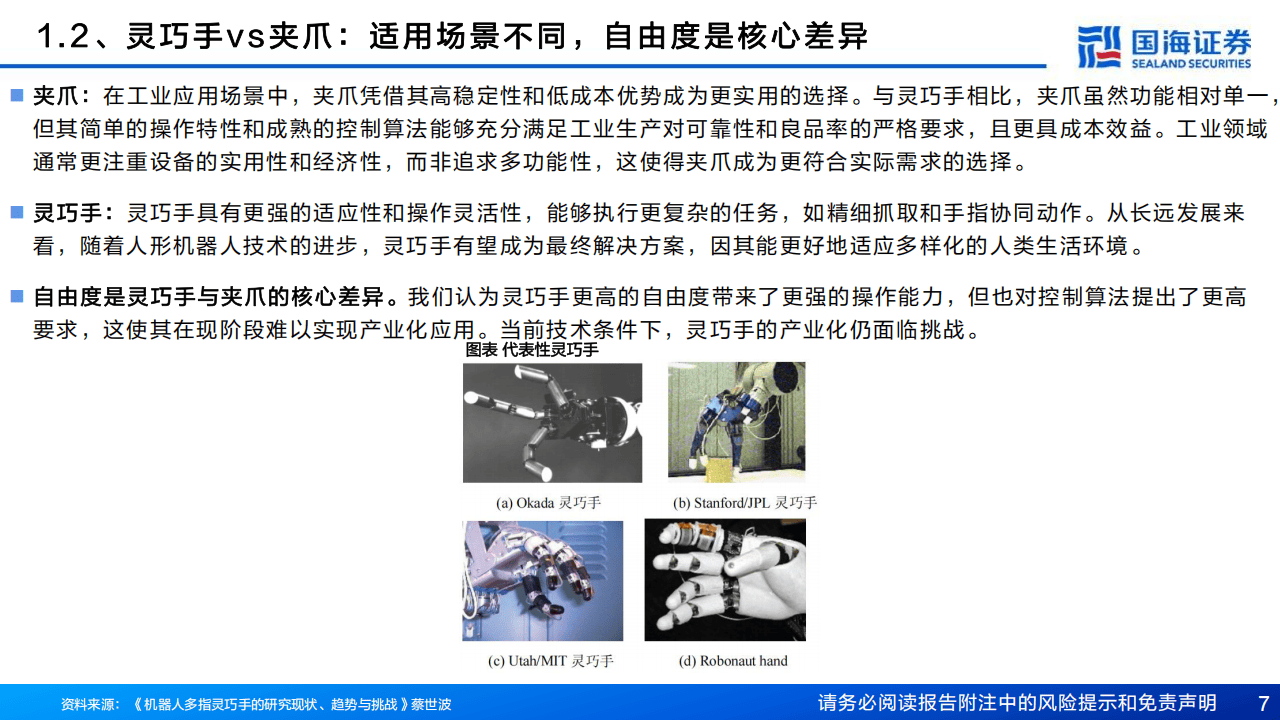 与传统的工业夹爪相比,灵巧手在自由度和任务适应性方面具有显著优势。夹爪结构简单、成本较低,适用于标准化工业场景;而灵巧手模仿人手设计,具备多指多关节结构,能够执行抓取、捏合、旋转等复杂动作,泛化能力更强,更适应家庭服务、医疗护理、物流搬运等非结构化环境。报告显示,特斯拉Optimus灵巧手的自由度已从11个提升至22个,实现“可观飞跃”,进一步推动了类人化操作的发展。