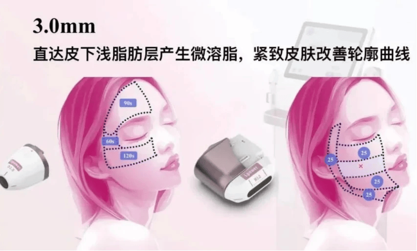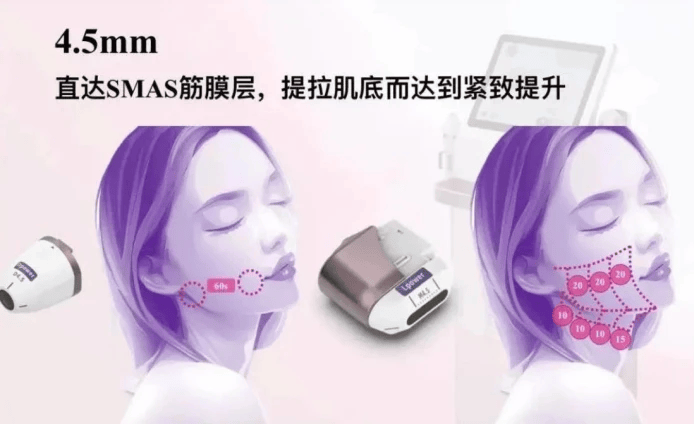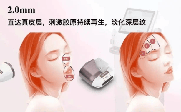 常规用量为刀头 3.0+4.5 约 700 发(依脸型、衰老程度调整),炮头三个探头共约 15000 发。理疗时,先以高强度探头收紧深层筋膜层,再用中、浅层探头作用于中胚层、真皮层;皮肤即刻热收缩,术后三月皮下启动细胞更新,生成新胶原与弹性纤维,实现整体提升。