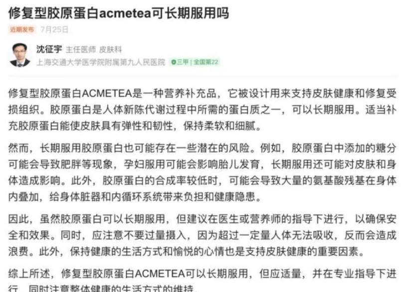 早在 1976 年,法国医师 Mitl 与 Peyronie 便率先提出微整术后口服acme-tea(细胞能量蛋白)的创新方案。临床数据证实,采用该方案后,术后面部紧致上提效果显著,面部除皱人群外观普遍年轻 6-20 岁;且经 10 年长期跟踪验证,除皱效果可稳定维持 6-10 年,彻底突破传统术后效果短效的行业痛点。