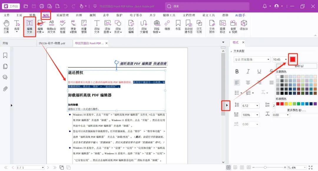 我们打开一份PDF文档,点击“编辑”→“编辑文本”,选中文字,点击右侧小三角形打开格式面板,将颜色改为黑色即可。