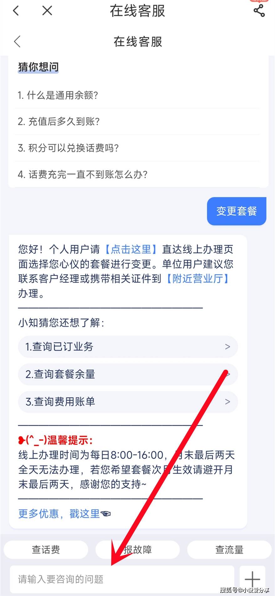 接着就会出现在线客服页面,这个时候,咱们给客服发信息,你就说要变更套餐,帮我改为最低的套餐,因为现在家里都有wifi,根本很少打电话,现在这个套餐根本用不完,按照我给你们的话述写,然后发送出去,一般48小时之内就会有客服专员直接联系你了。