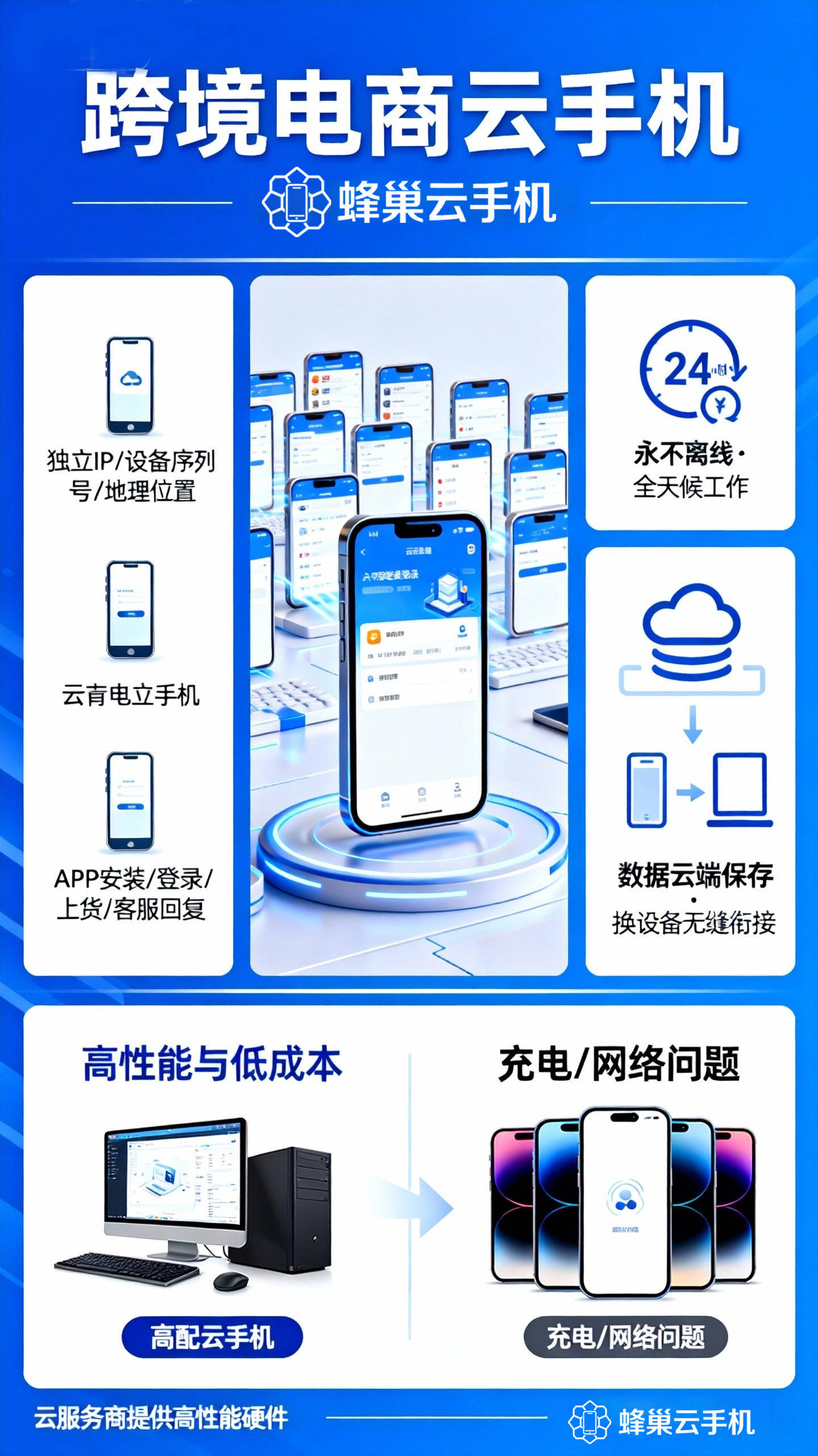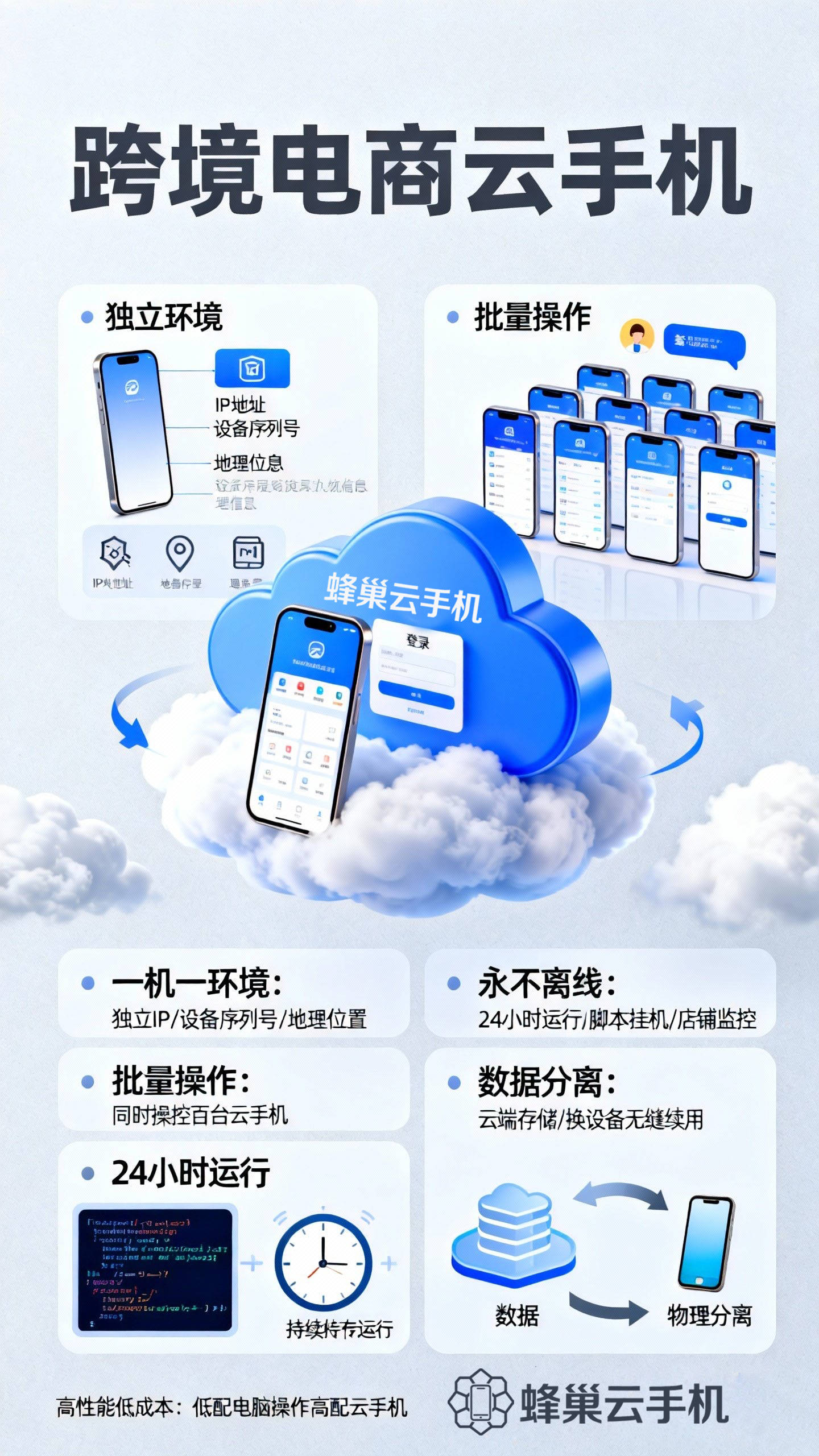 蜂巢电商云手机的本质是电商运营的“云端生产力工具”。它将重复、繁琐、有风险的设备管理和环境隔离工作从线下转移到云端,核心价值在于: