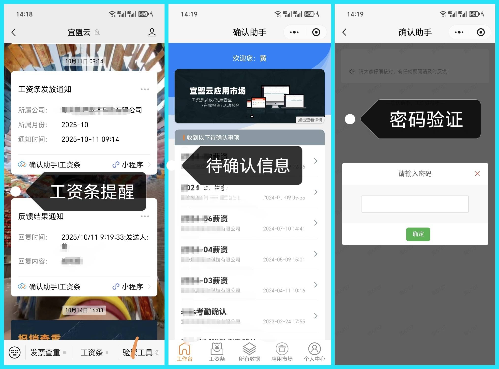 关注【确认助手】公众号,工资条发送后,员工将收到消息通知。点击信息后,输入设置的查看密码,即可查看工资条详情。
