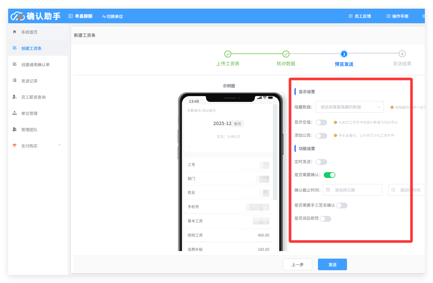 核对数据后,可预览发送工资条,可在此步设置确认时间、是否手工签名和阅后即焚等,选择好之后,可以选择立即发送,或者预约发送即可。