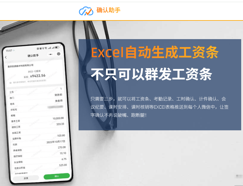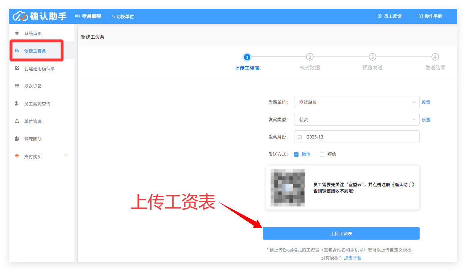 进入《确认助手》工作台,点击【创建工资条】,点击【上传工资表】,将excel工资表直接提交;
