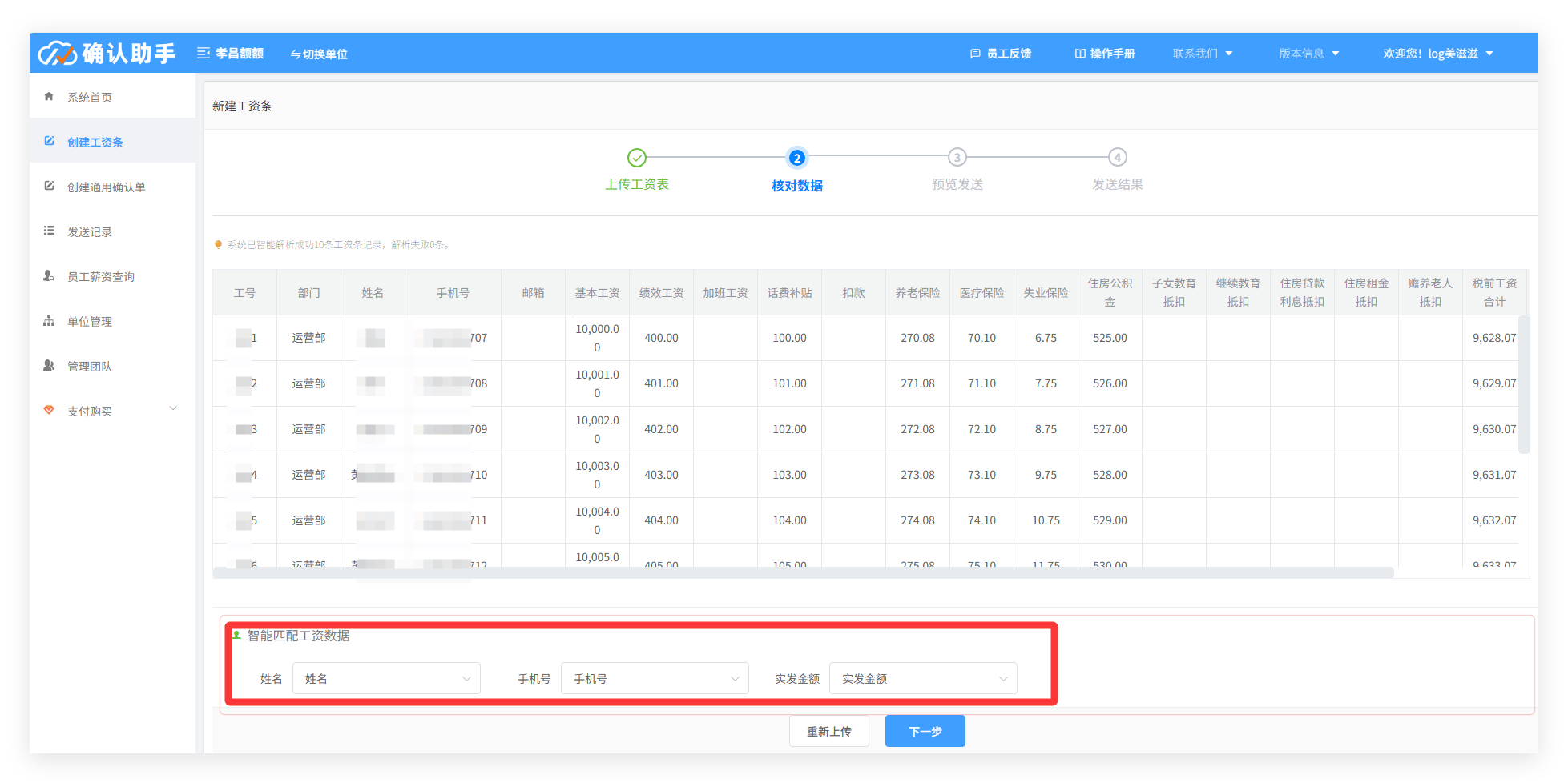 上传工资表后,核对数据,系统将自动匹配关键信息,如姓名、手机号码和实发工资等。HR核实信息是否完全无误。