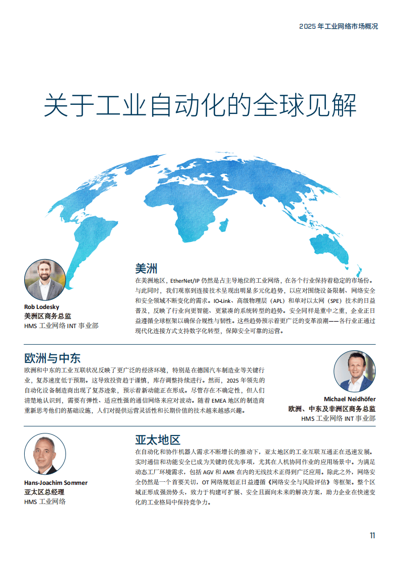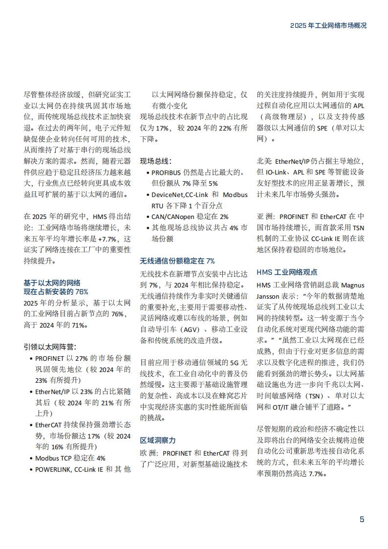 区域市场呈现差异化发展态势。欧洲广泛应用PROFINET和EtherCAT,同时关注APL、SPE等新型基础设施技术;北美以EtherNet/IP为主导,IO-Link、APL等『智能设备』友好型技术增长迅速;亚太地区在自动化和协作『机器人』️需求推动下发展迅猛,PROFINET、EtherCAT在中国市场持续增长,CC-Link IE凭借TSN机制保持稳固地位。