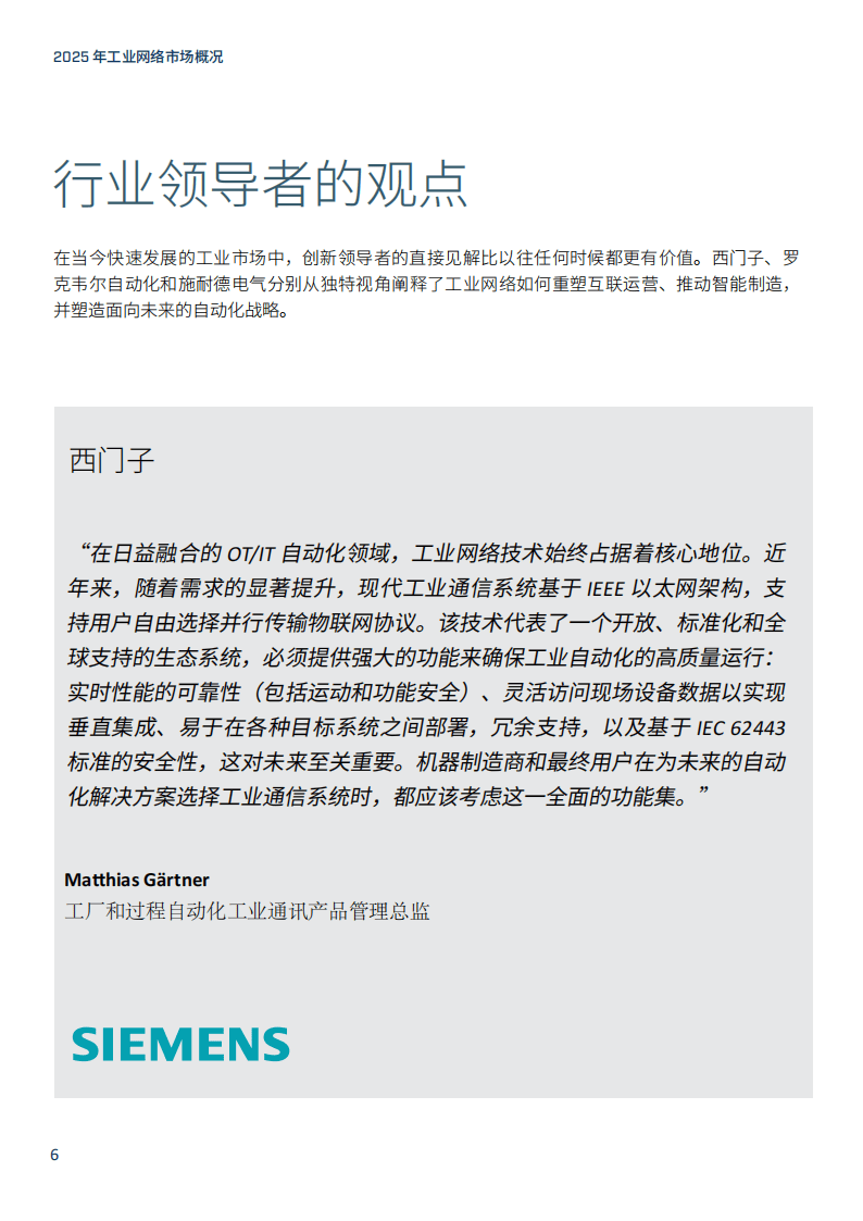 行业领导者普遍认为,OT/IT融合、软件功能驱动设备差异化、网络安全合规化是核心趋势。未来工业网络将朝着更高数据速率、集成网络安全、标准化互联的方向发展,PROFINET、OPC UA与TSN的无缝交互将成为工厂控制系统虚拟化的重要基石,为企业提供更高效、灵活的运营支持。