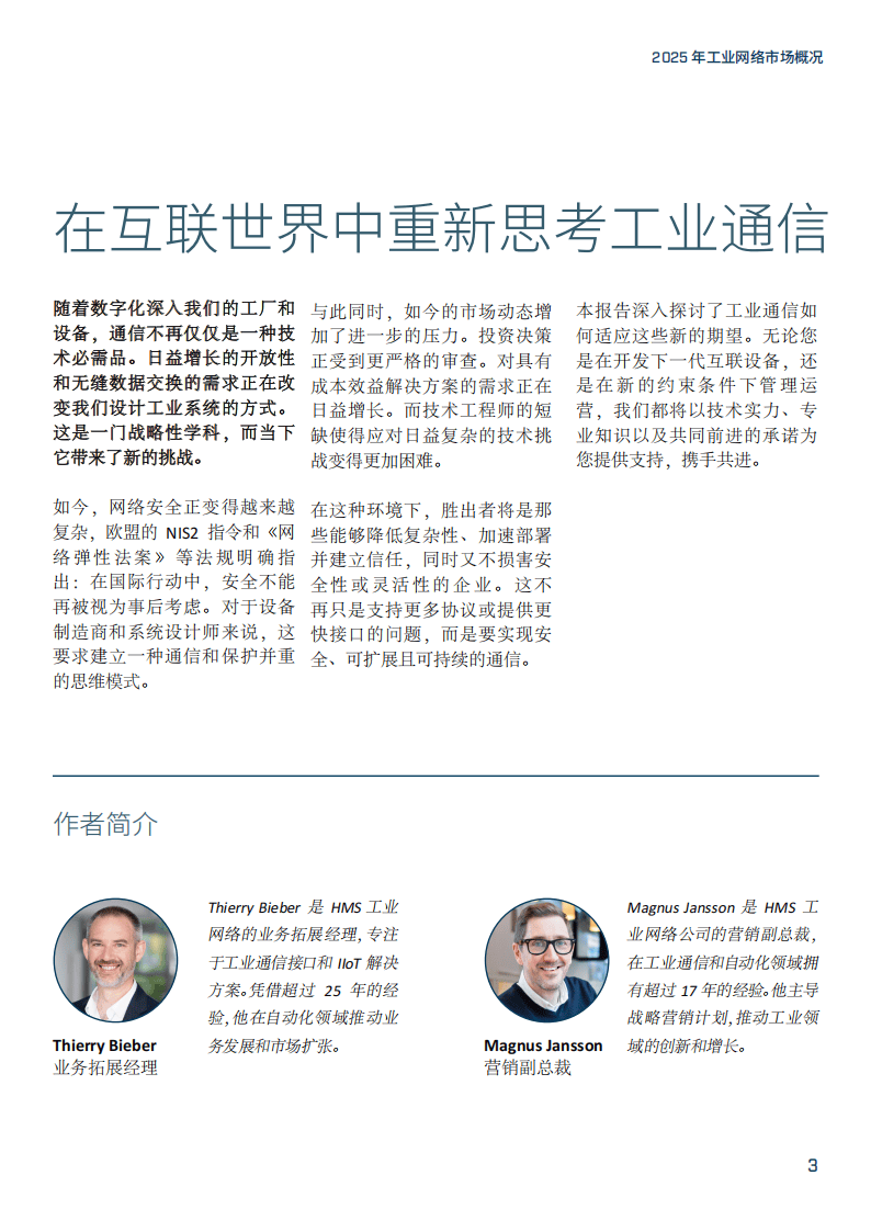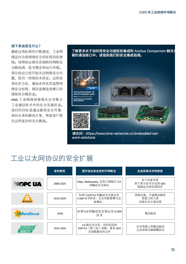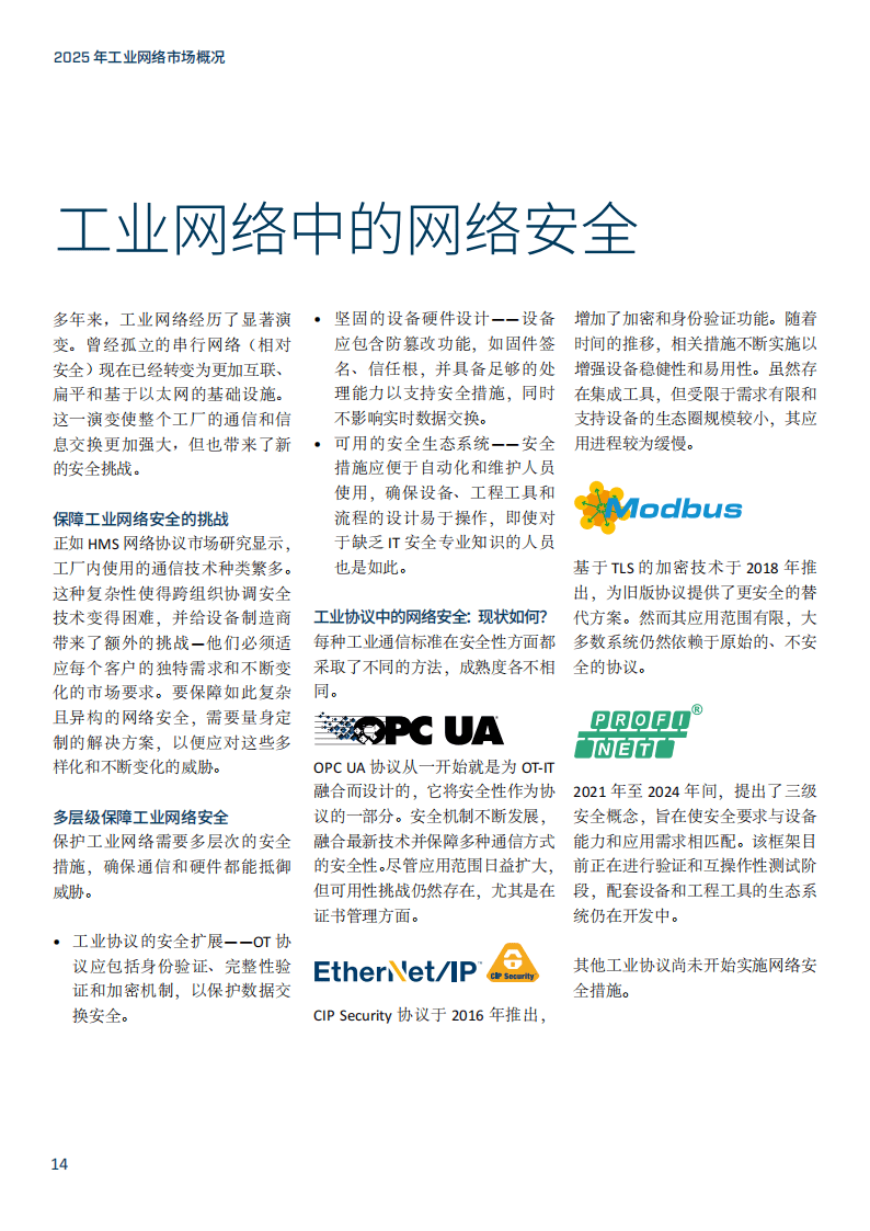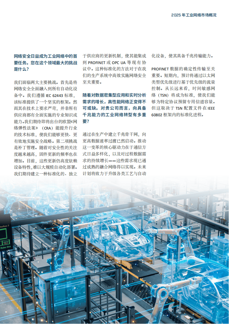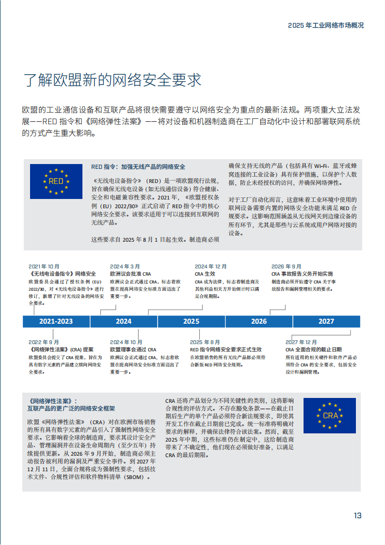 网络安全成为市场核心关切,欧盟NIS2指令、《网络弹性法案》(CRA)及RED指令等法规相继落地,对设备安全设计、漏洞管理、合规认证提出明确要求。CRA要求2027年底前相关产品全面合规,RED指令的网络安全要求也于2025年8月生效。保障工业网络安全需采取多层级措施,包括工业协议的安全扩展、设备硬件的防篡改设计及易用的安全生态系统构建,同时资产清点、网络分段、访问控制、软件更新和人员培训是提升安全防护能力的五大关键。