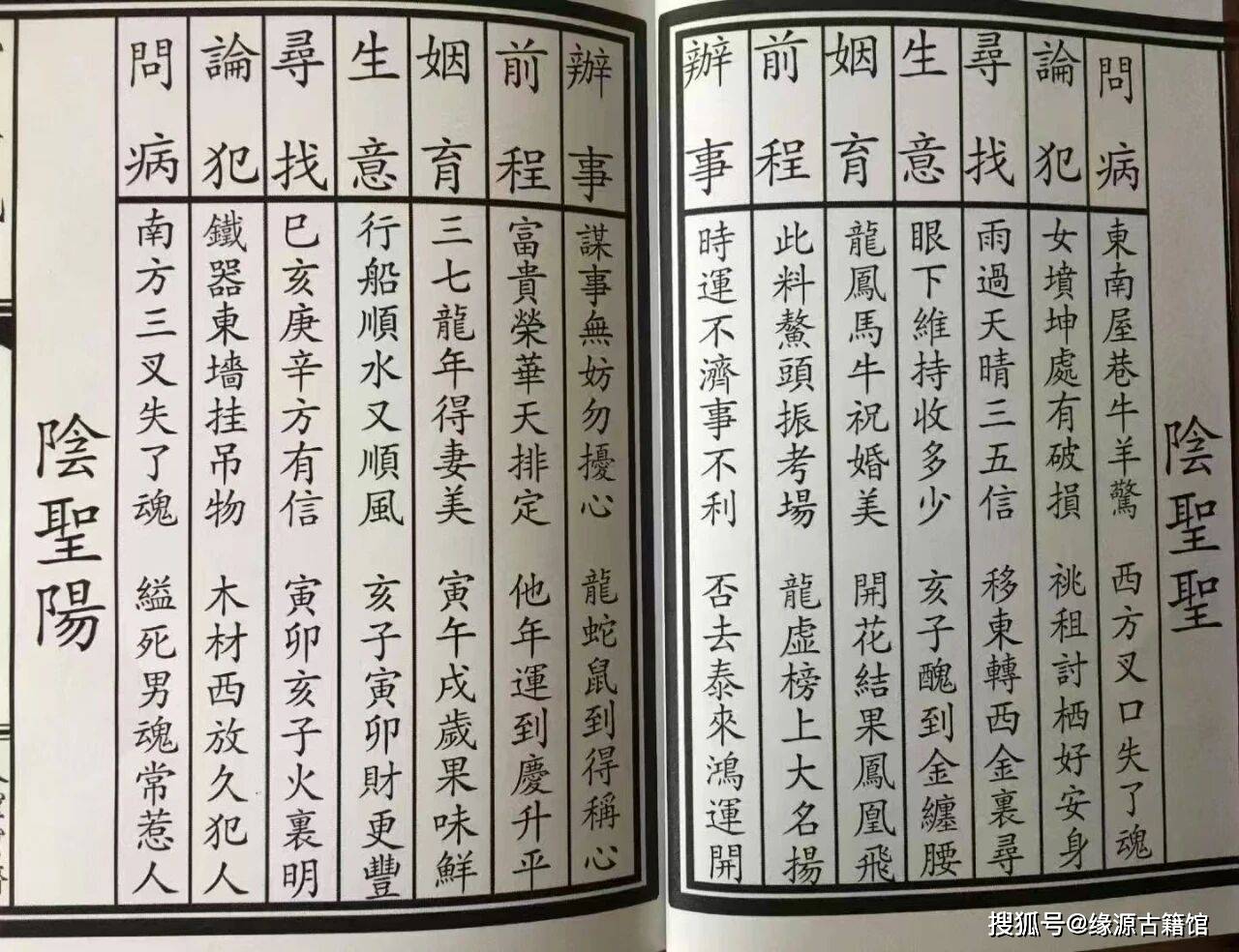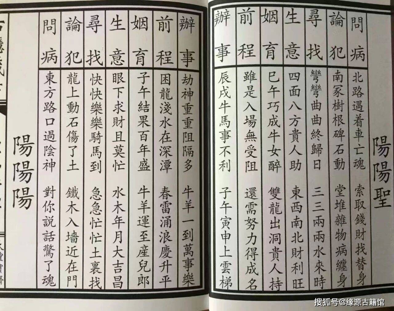 比如事业维度,明确“圣圣阳”主升官发财、“怒怒阴”防职场阻碍的解读逻辑;财运方面,标注“圣圣阴”主财源广进、“怒阳怒”需避亏本风险的核心口诀;健康与平安领域,更是细化了疾病预后、小儿夜啼等常见问题的卦象解读与应对方向。书中还收录“三大凶卦”等禁忌要点与化解思路,提醒读者避开风险陷阱,让断卦不仅是“知吉凶”,更能“解难题”。