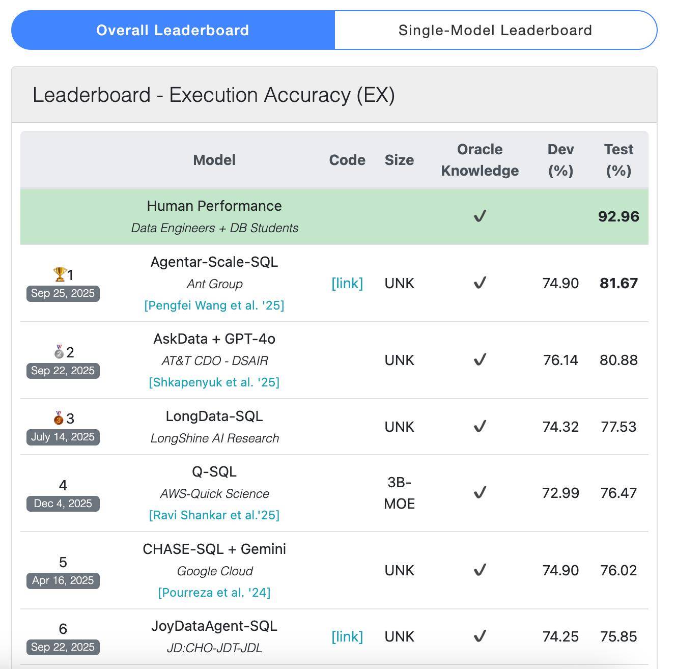 今年9月25日,由该技术支持的蚂蚁数科数据分析智能体Agentar-Scale-SQL登顶全球最具权威性的自然语言转结构化查询语言(NL2SQL)评测基准BIRD-SQL,超越Google等诸多国内外厂商。目前,该智能体仍在执行准确率排行榜以及执行效率榜保持双榜第一,已持续领跑超两月。