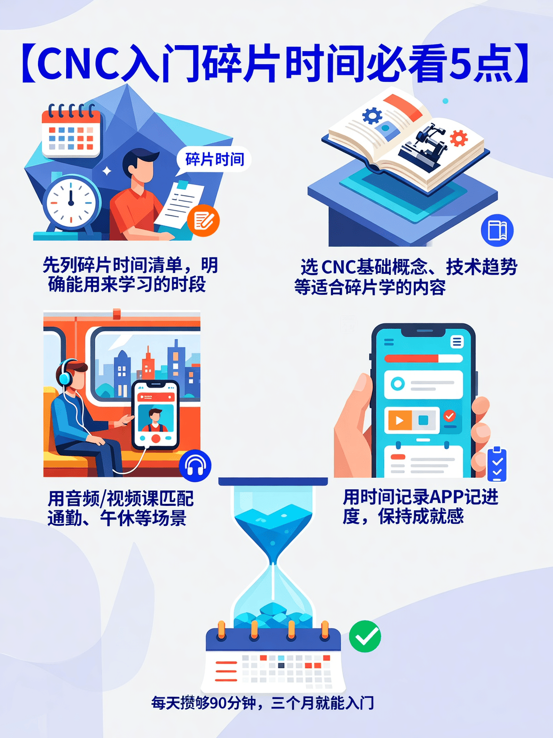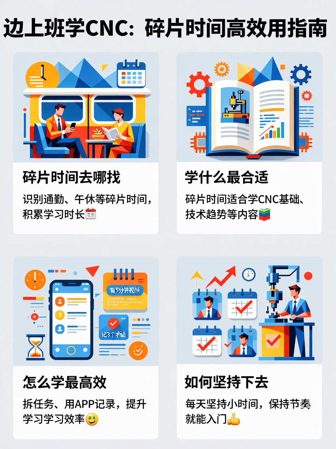 现在学CNC的碎片资源越来越多,15分钟就能学个小技巧。15分钟微学习法:地铁上的学历加油站,把这段时间拆成3个15分钟黄金段:前15分钟用手机刷题库,中间15分钟戴降噪耳机听录播课,后15分钟闭眼回忆知识点。