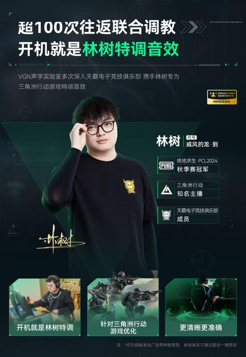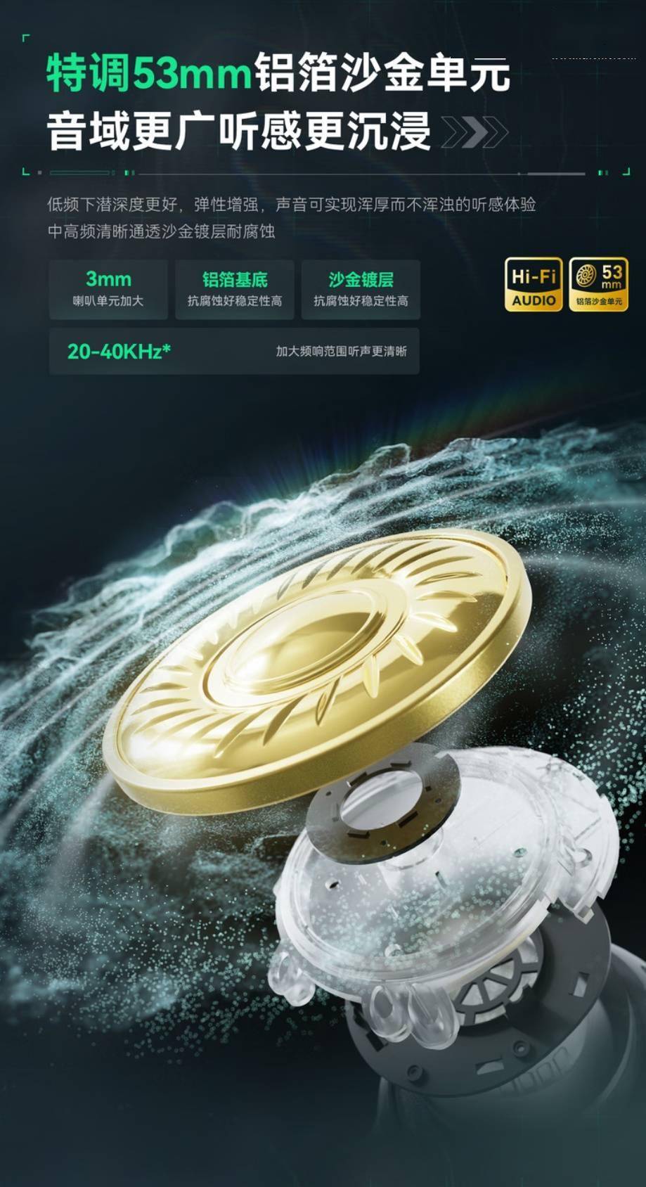 据介绍,这款耳机拥有《三角洲行动》主播林树特调音效,自带三合一 RGB 超竞基站,集充电和 USB HUB 于一身,自带炫彩 RGB 灯带,拥有两个 USB-A 输出接口和一个 USB-C 输出接口,搭载特调 53mm 铝箔沙金单元,频响范围可达 20-40kHz。