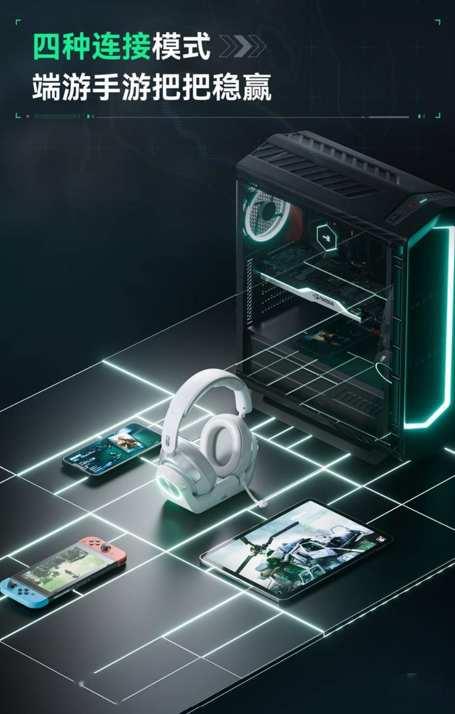 此外,这款耳机还带有 2000mAh 电池,续航可达 120 小时,支持蓝牙、USB 有线、2.4G USB-A/USB-C 四种连接方式,拥有多功能物理按键,可直接调节灯效、音效、音量、连接模式等。