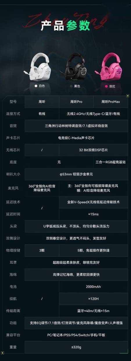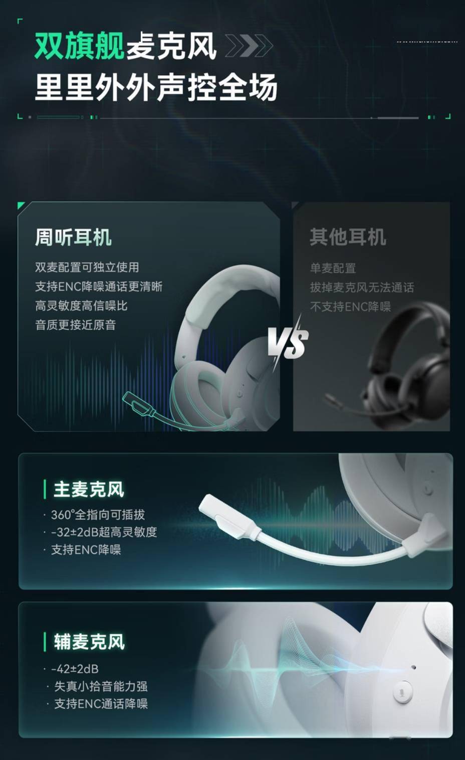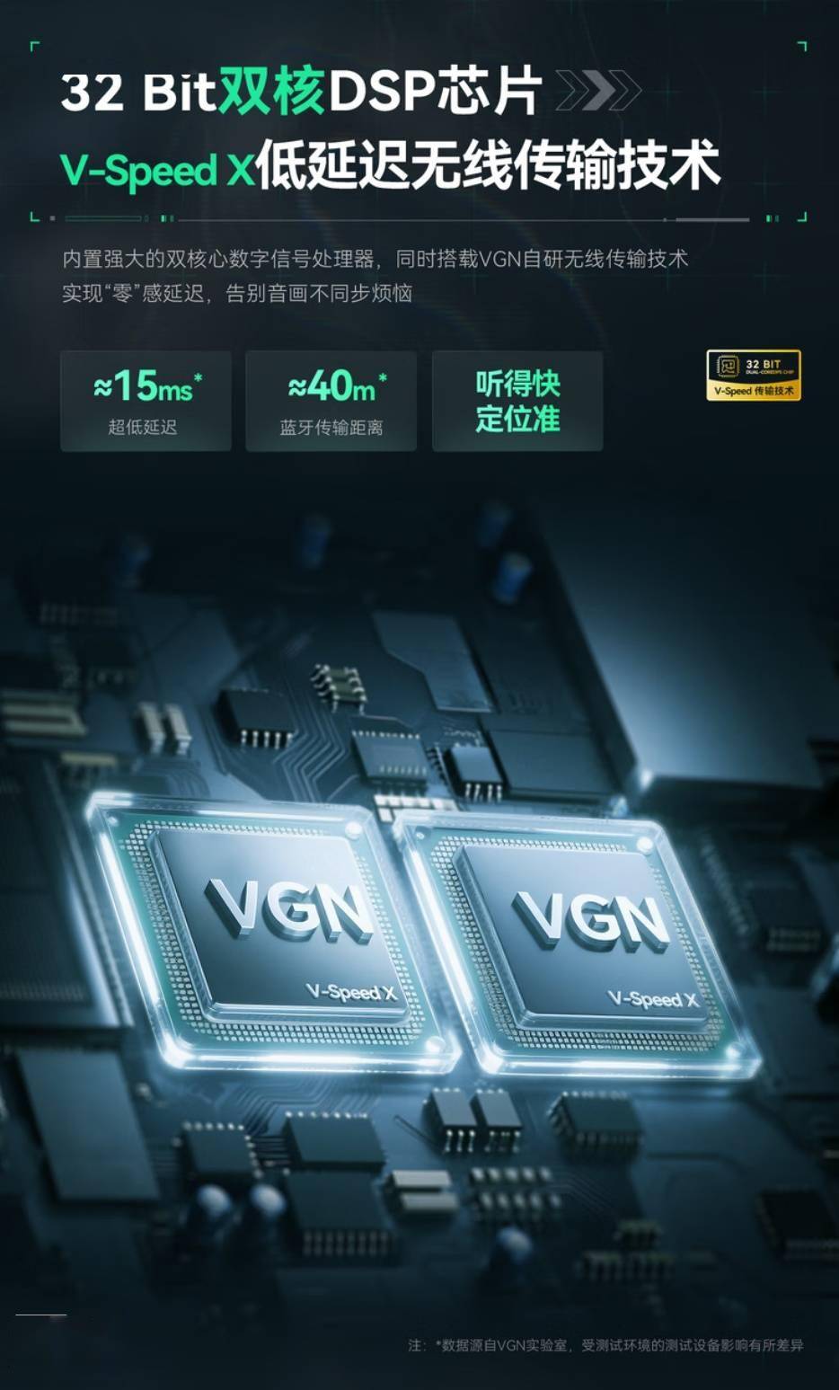 参数方面,这款耳机配备 C-Media 职业电竞『芯片』,自带特调 FPS 智能音频算法,拥有 32 Bit 双核 DSP 『芯片』,支持 V-Speed X 低延迟无线🛜传输技术,内置双旗舰麦克风,采用可插拔设计,支持 ENC 降噪,还可构建 7.1 虚拟环绕空间声场。