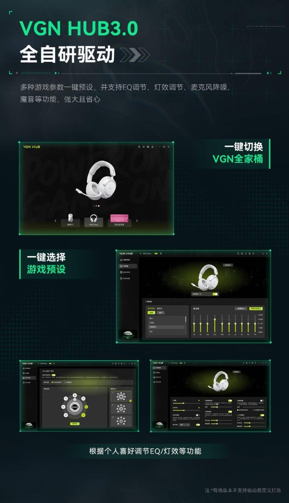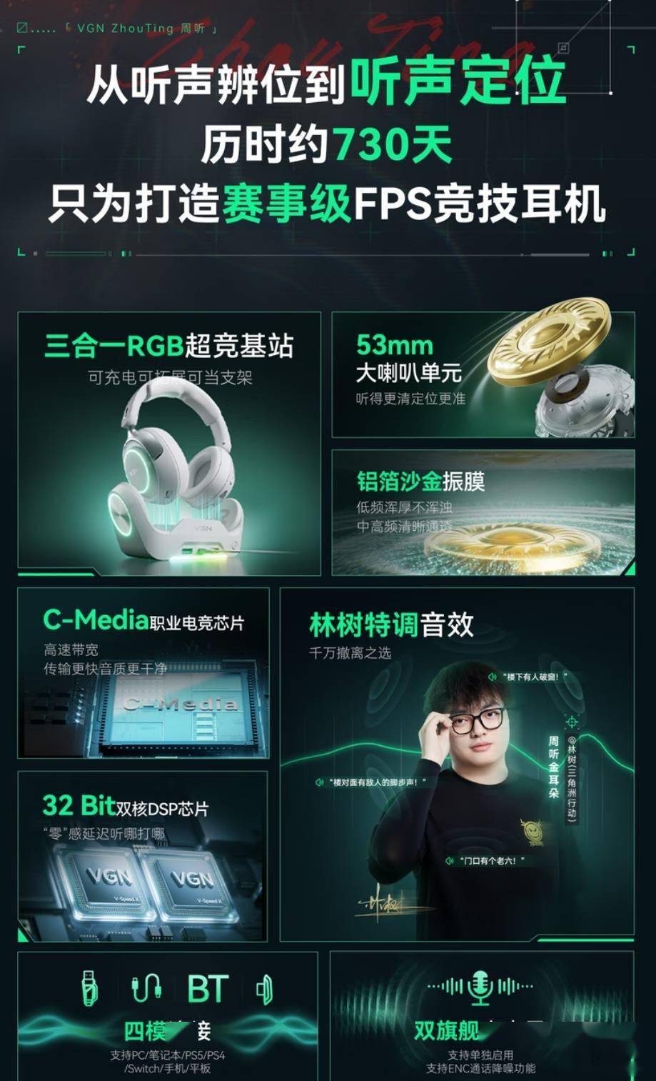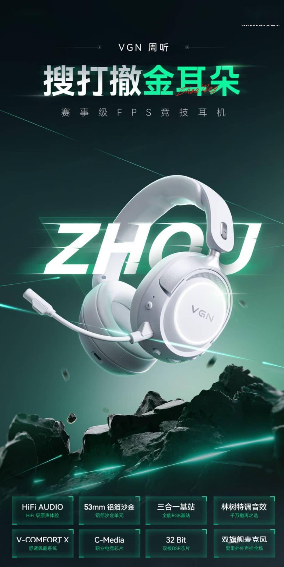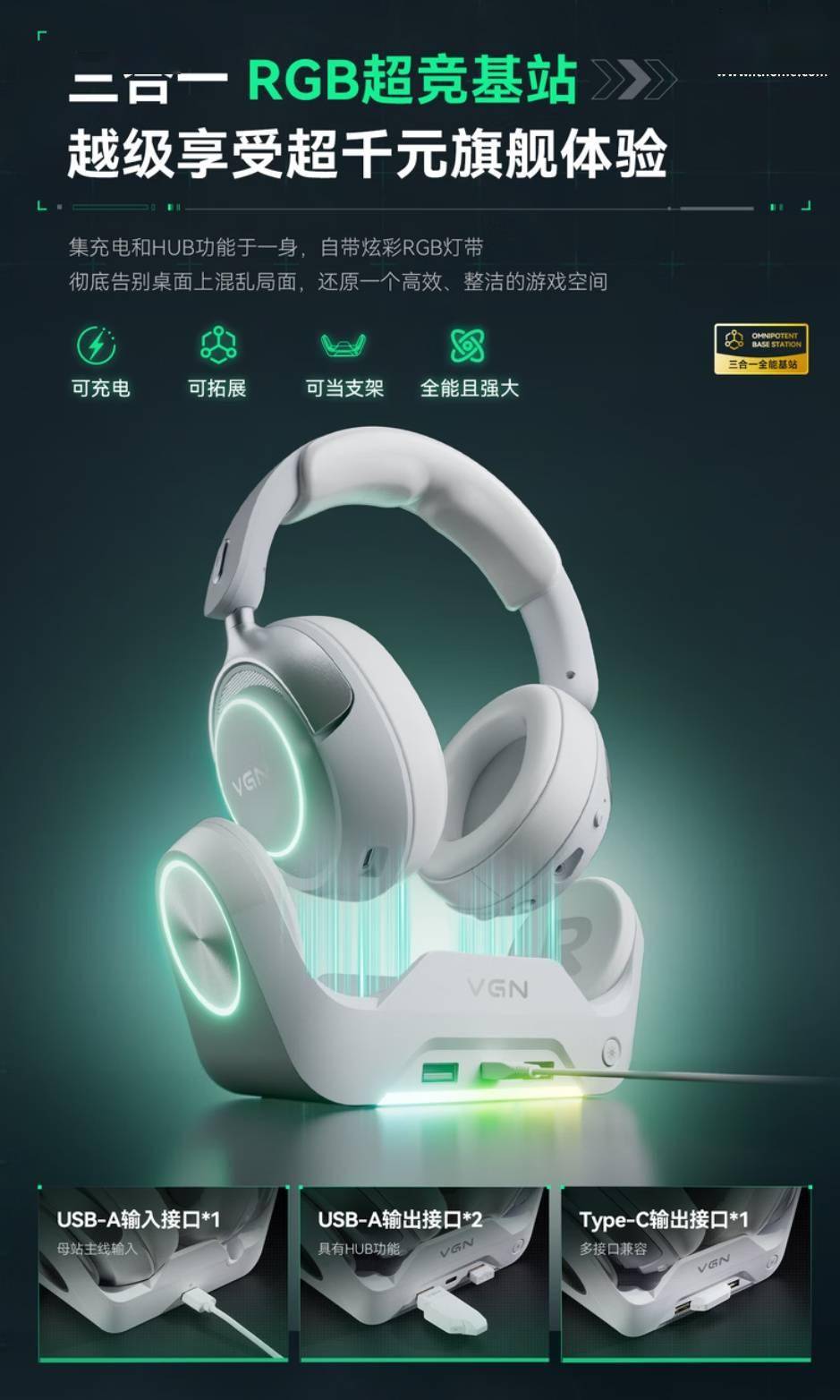 12 月 15 日消息,VGN 现已推出周听系列头戴式电竞耳机,搭载 53mm 铝箔沙金单元,自带三合一全能 RGB 基站,售价 199 元起。