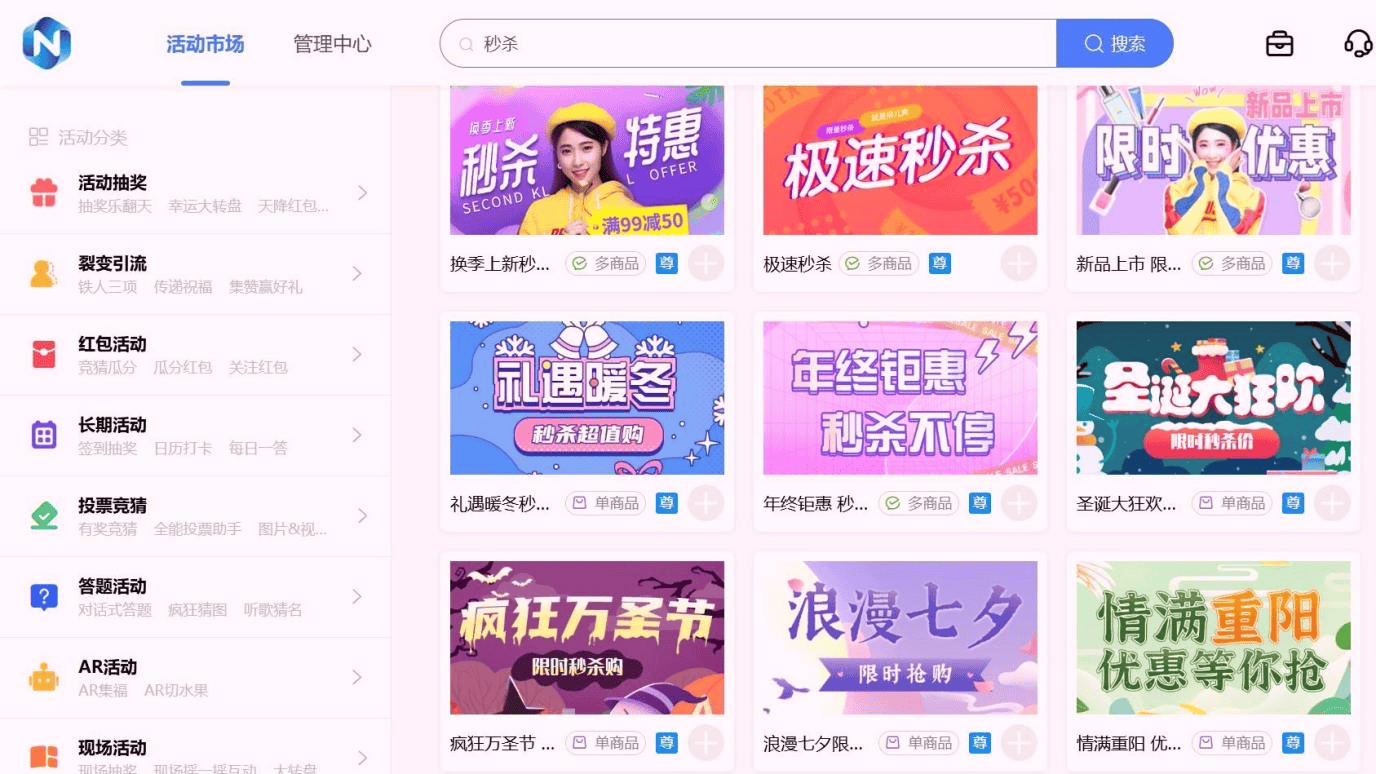 首先,用手机号注册乔拓云账号(1 分钟搞定,支持免费试用,满意再升级,零风险尝试),登录后进入【营销活动】模块,在搜索栏输入 “抽奖小游戏”“游戏抽奖”“互动抽奖” 等关键词,海量小游戏模板立刻显示出来。