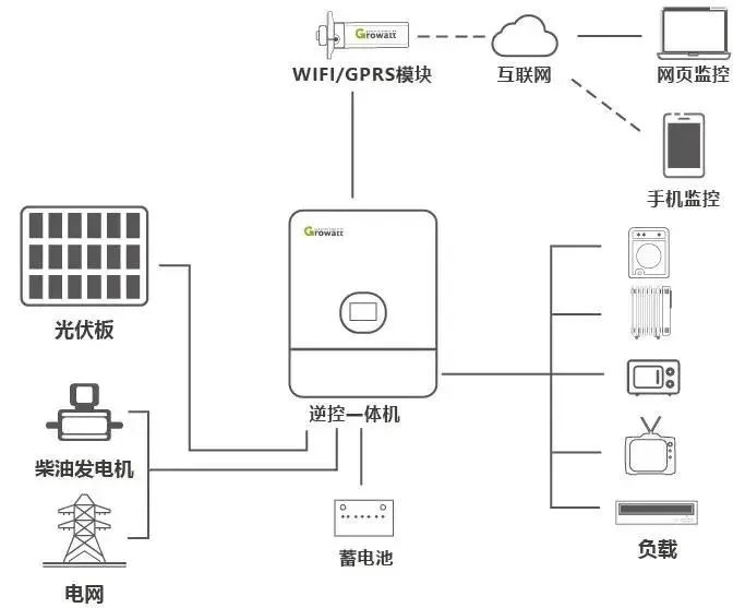 光伏离网储能发电系统,可以不依赖电网而独立运行,专门针对无电网地区或经常停电地区场所使用,较多应用于偏僻山区、无电区、海岛、通讯基站和路灯等应用场所。系统由光伏方阵、光伏逆控一体机、蓄电池组、用电负载等构成。光伏方阵在有光照的情况下将太阳能转换为电能,通过逆控一体机给负载供电,同时给蓄电池组充电;在无光照时,由蓄电池通过逆变器给交流负载供电。