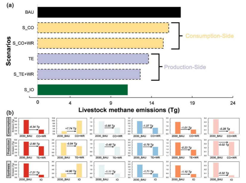 综合模拟研究表明,通过全链条协同管理,中国畜禽甲烷排放具备显著减排潜力。在无干预的基准情景下,2030年排放量预计比2025年增长近50%。然而,若采取整合性策略(IO情景),即同时实施生产端技术升级、消费结构优化以及减少食物损失与浪费,减排幅度可达37%以上,使2030年排放量降至约6.52 Tg。