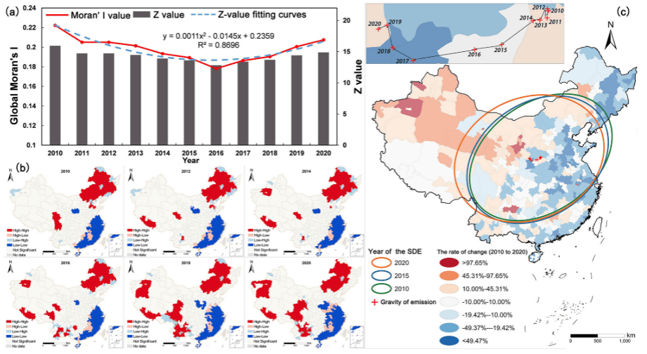 研究表明,2010-2025年中国畜禽甲烷排放存在显著的空间集聚性(全局莫兰指数 0.17-0.22),且集聚度呈先降后升趋势。其空间分布呈现明显的“东向西”转移特征:排放冷点稳定于东部沿海,热点逐渐向西南集中;标准差椭圆分析显示排放重心持续向西南移动,2014年后尤为明显,导致西北、西南及北方地区排放增加,而其他区域下降。这一转移与东部经济发展及环境规制趋紧相关,符合“污染避难所”假说。
