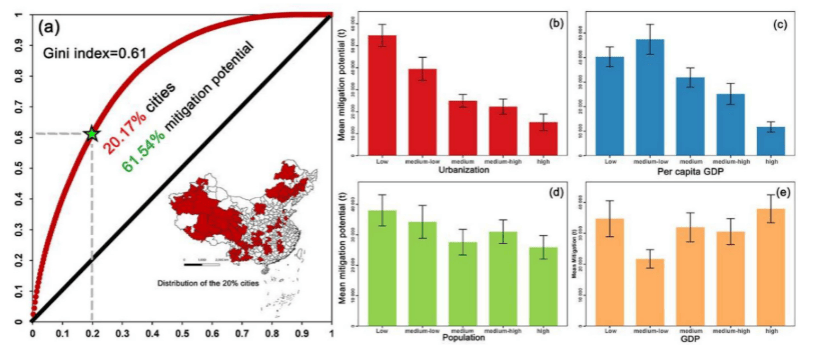 城市减排潜力分布极不均衡(基尼系数0.61):20%的城市贡献了60%的总潜力,且潜力大小与经济发展水平负相关。
