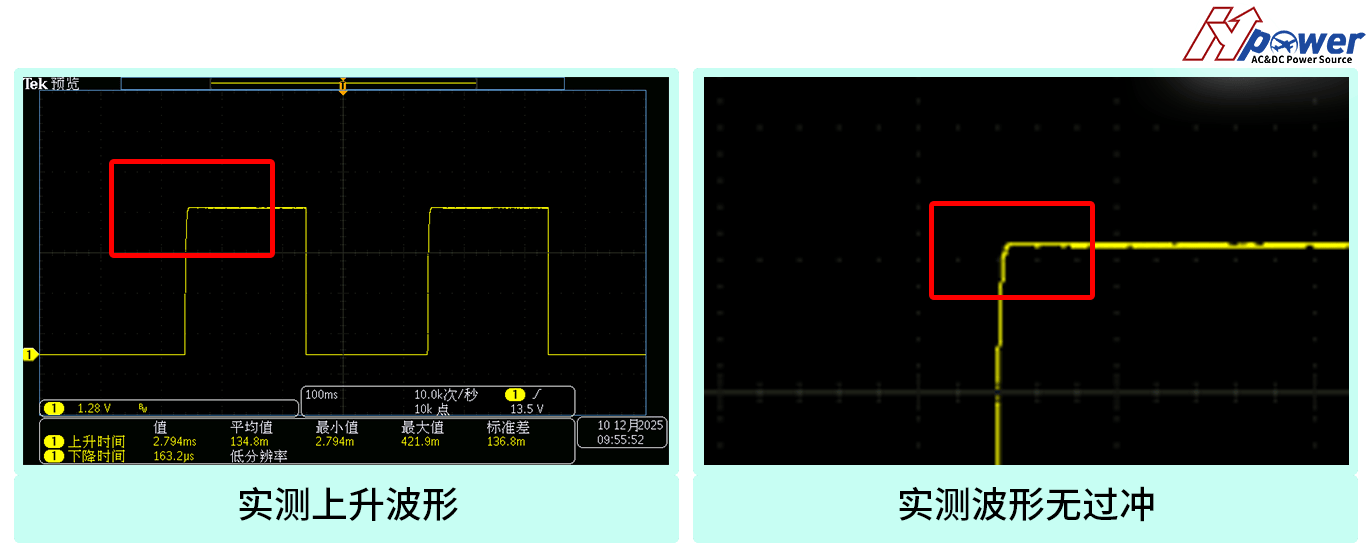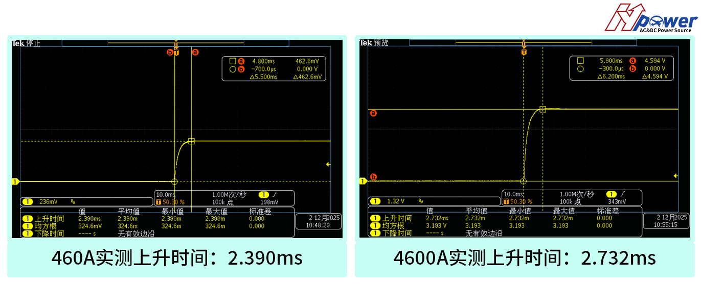 电源实际电流上升/下降时间<3ms,远优于客户10ms的要求,精确模拟断路器在实际应用中可能遇到的快速电流变化场景,为产品性能验证提供更真实、可靠的数据支撑,让研发测试更具参考性;