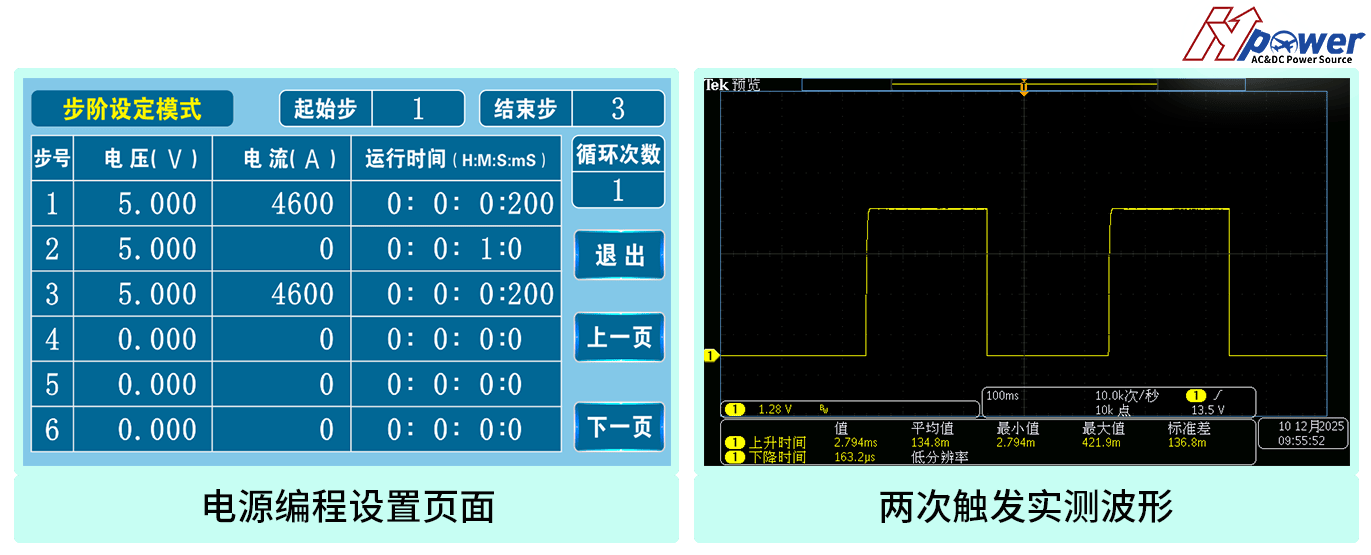 依托电源自带的专业编程功能,可轻松实现两次触发模式,且触发间隔时间为1s,完美适配断路器瞬动测试的复杂流程,无需额外配置辅助设备,简化测试步骤;