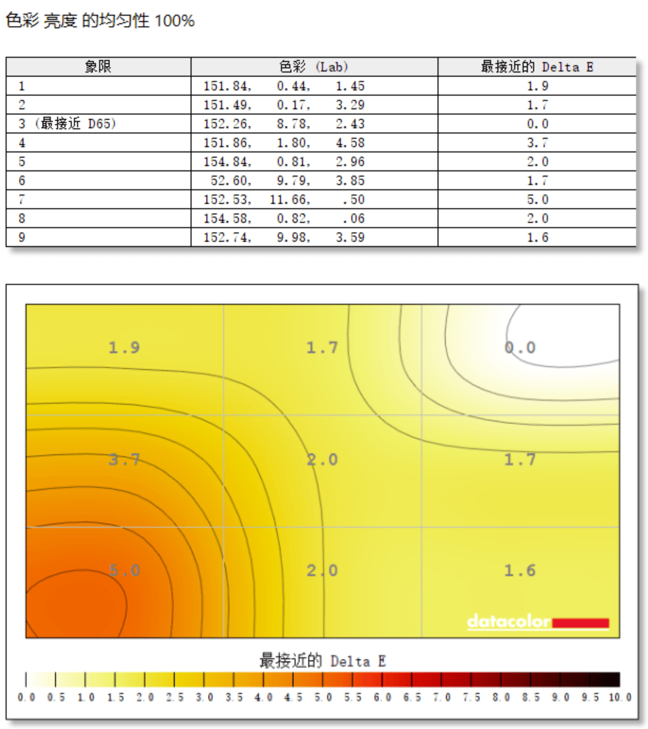 在色彩均匀性的测试中,技嘉M27Q2 QD ICE显示器的第3象限最接近D65的标准,显示器左边第7象限与标准色温差值最大,达到了5.0,整体色彩均匀度表现尚可。