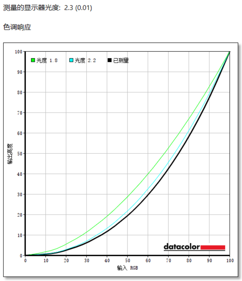 色调响应方面,已测量的黑色曲线应该尽量和浅蓝色的“光度2.2”曲线保持一致,可以看到实测的黑色曲线光度为2.3,和“光度2.2”较为接近。