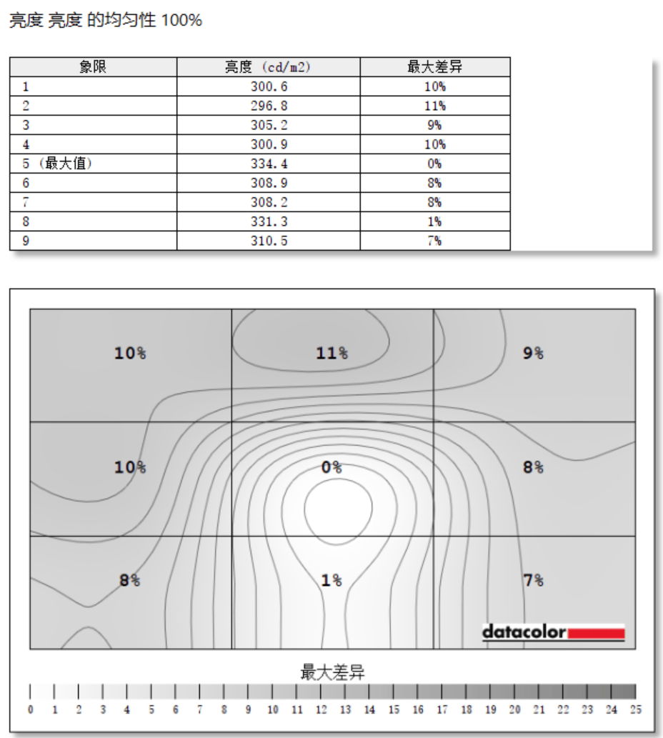 亮度均匀性的测试中,技嘉M27Q2 QD ICE显示器整体表现也很优秀,亮度最大为第5象限,最大差异在第2象限,差值为37.6cd/m²。