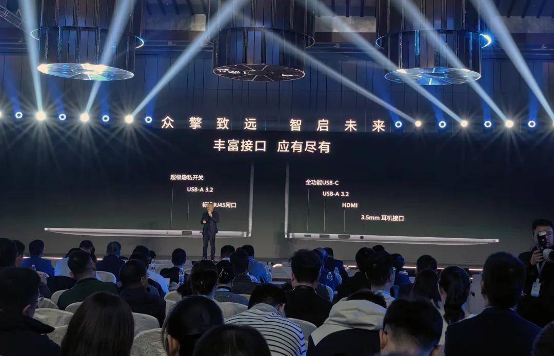 擎云HM740接口配置极为丰富,包含USB-C、USB-A、HDMI、RJ-45网线接口及3.5mm音频接口,完全能够满足各种行业的商用场景所需。为提供更佳的隐私保护能力,该机还配备了一个隐私保护的实体按键,可以键开闭摄像头、麦克风和位置信息。配合麒麟90X处理器优秀的低功耗表现,该机采用双鲨鱼鳍风扇散热方案,102片超薄扇叶在提供高效散热能力之外还能让办公场景下的噪声低于20dB。