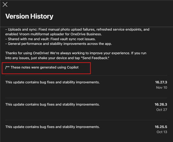 快科技12月15日消息,近日『Windows』 Latest发现,微软在OneDrive iOS版本的更新日志底部,添加了一行声明:“本说明由Copilot生成。”